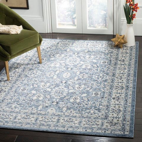 Charleston CHL412N from the exquisite Charleston Collection by SAFAVIEH. These traditional vintage-inspired area rugs are designed with contemporary oriental patterns, adding a touch of elegance to any space. The color palette includes shades of blue, grey, and cream, creating a sophisticated and versatile look.