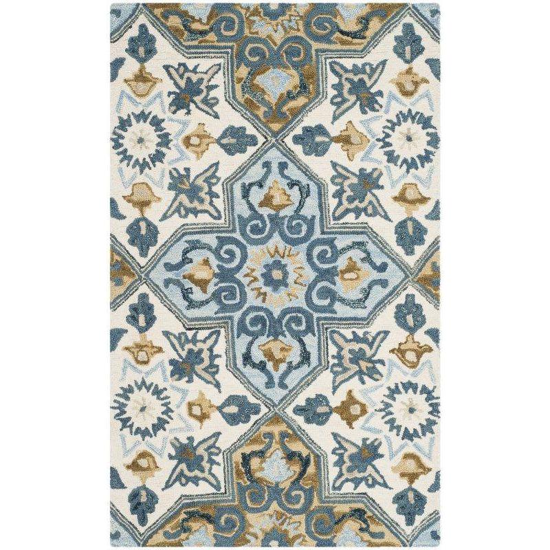 Suzani SZN380A Ivory Blue rug by Safavieh, a stunning piece that will rejuvenate your modern or bohemian interior. With its vibrant tribal motifs and free-spirited color palette, this rug is the perfect choice for adding a touch of character to any space. Crafted from high-quality wool, each rug is meticulously hand-woven to ensure intricate detailing and long-lasting durability.