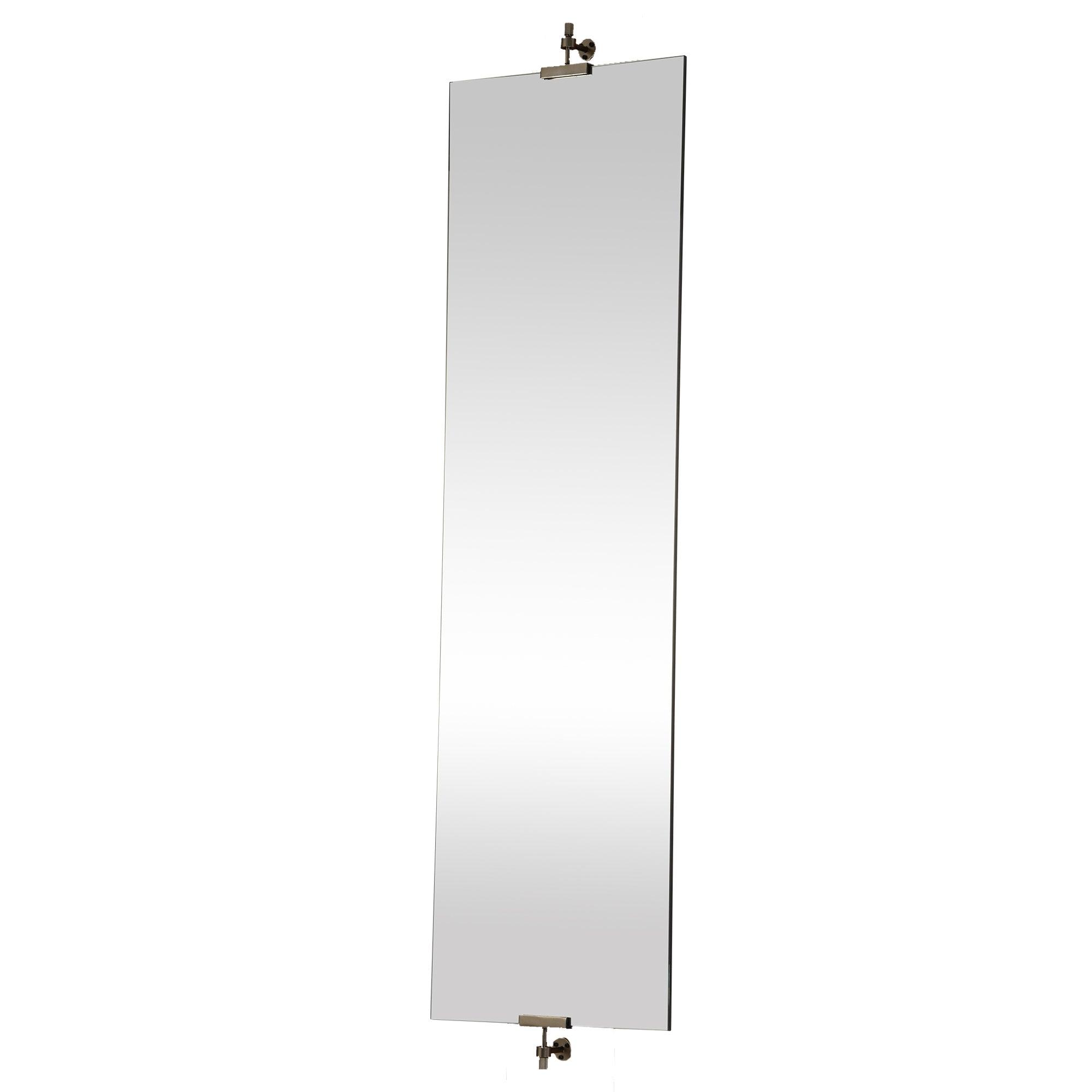 Ashlar Mirror, a sleek and modern full-length leaner mirror that draws inspiration from the industrial charm of the Arts and Crafts movement. Its all-glass design is accentuated by metal clip hardware located at the top and bottom, ensuring a secure placement on bedroom or bathroom walls. This unique mounting style resembles an artist's easel, elevating every reflection into a work of art. The Ashlar Mirror combines functionality with architectural appeal, making it a stylish and practical addition to any space. Transform your room with this elegant piece that effortlessly blends form and function.