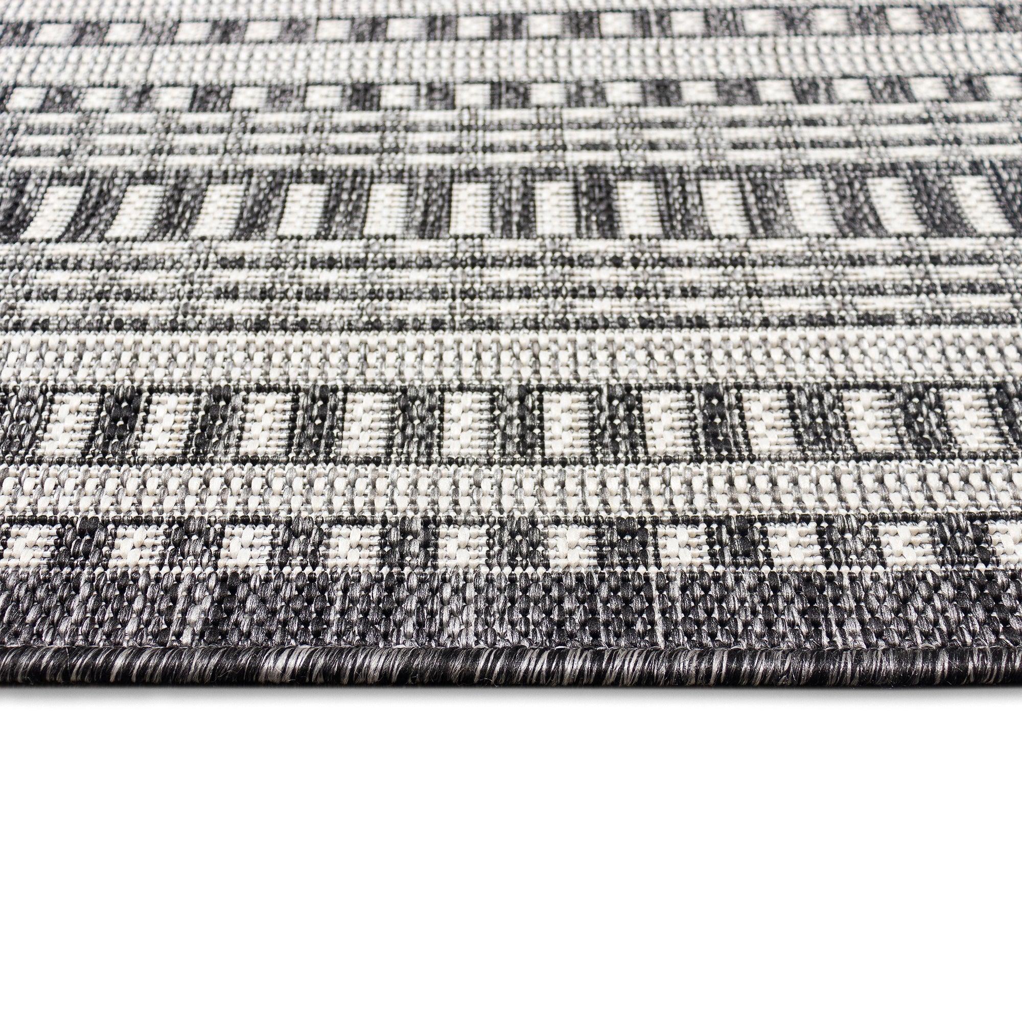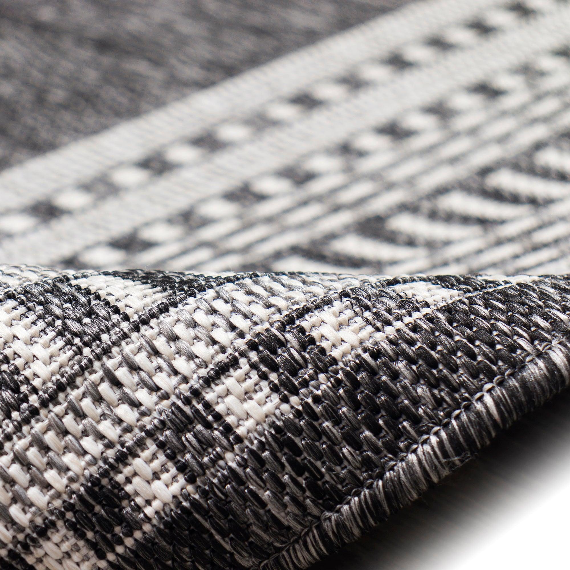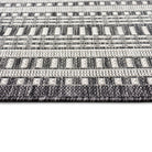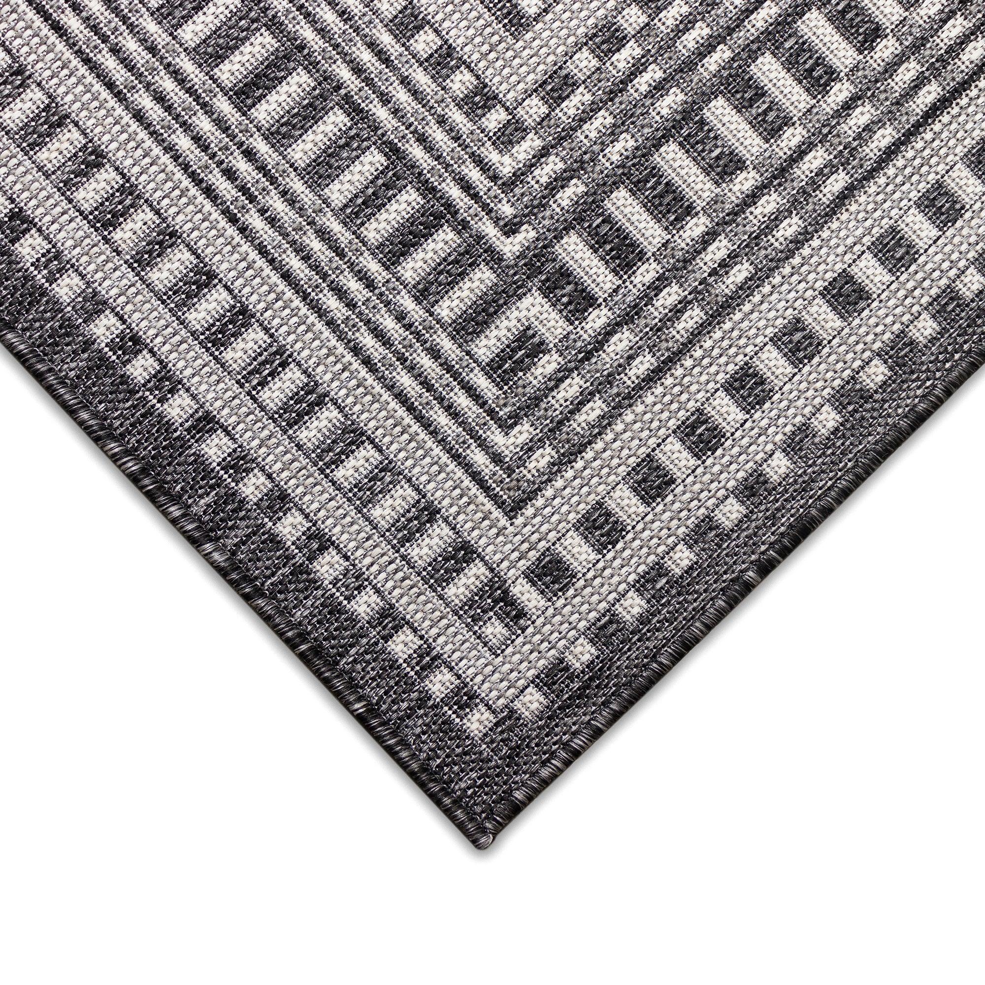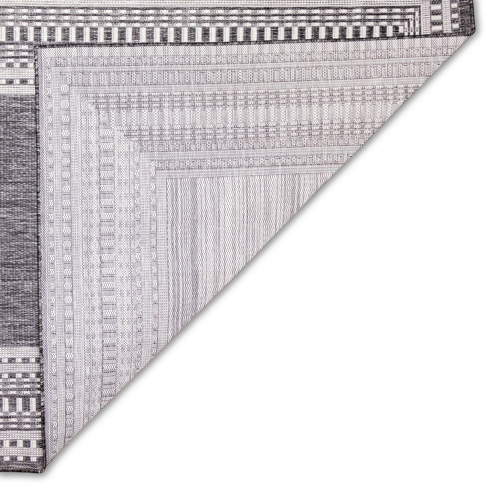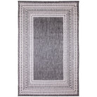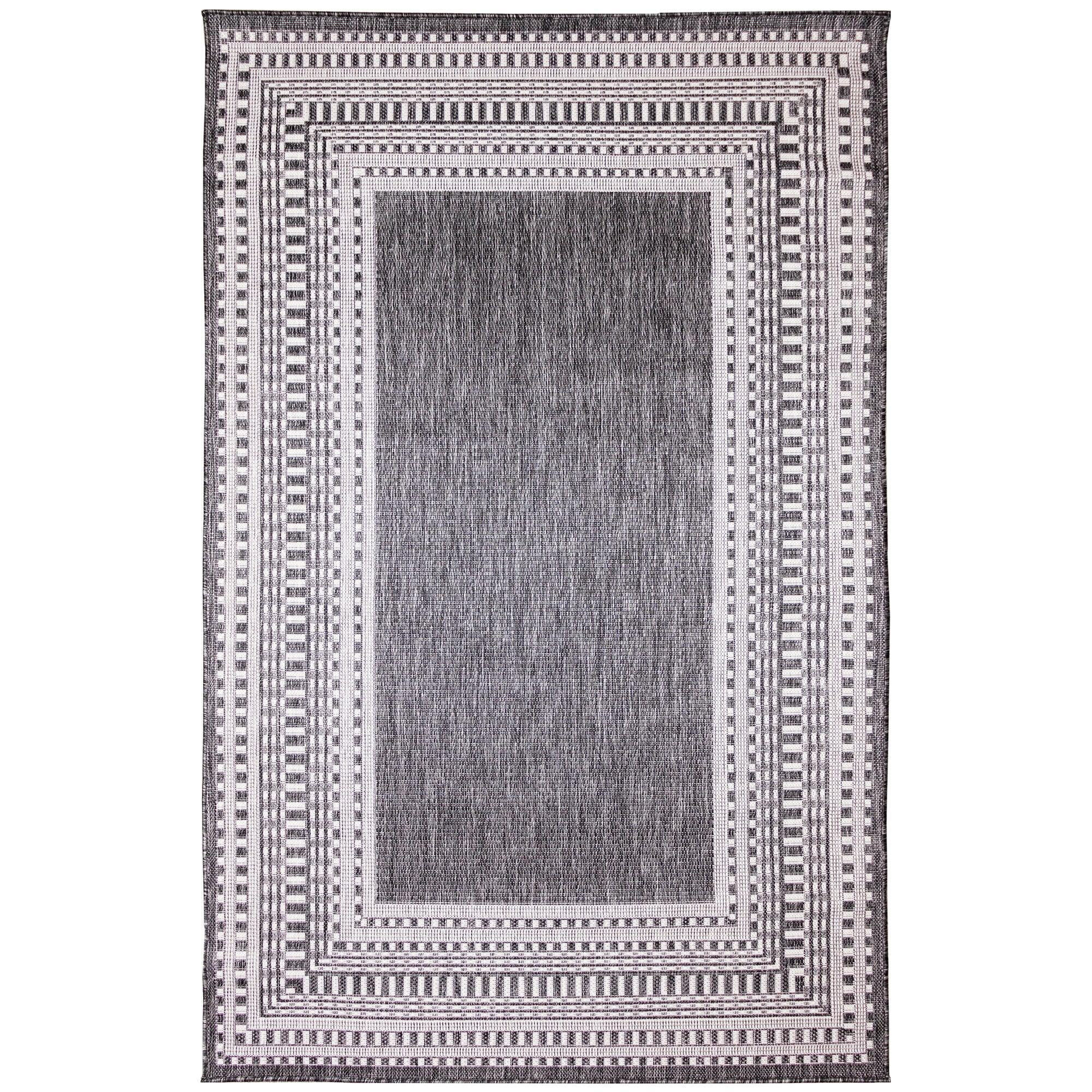 Malibu Etched Border Grey area rug, a unique and stylish addition to any indoor or outdoor space. This rug features a design with multiple borders, creating a striking visual impact that will enhance the look of your home. The contemporary color palette includes a charcoal grey background with ivory accents, perfect for blending seamlessly into your existing decor.