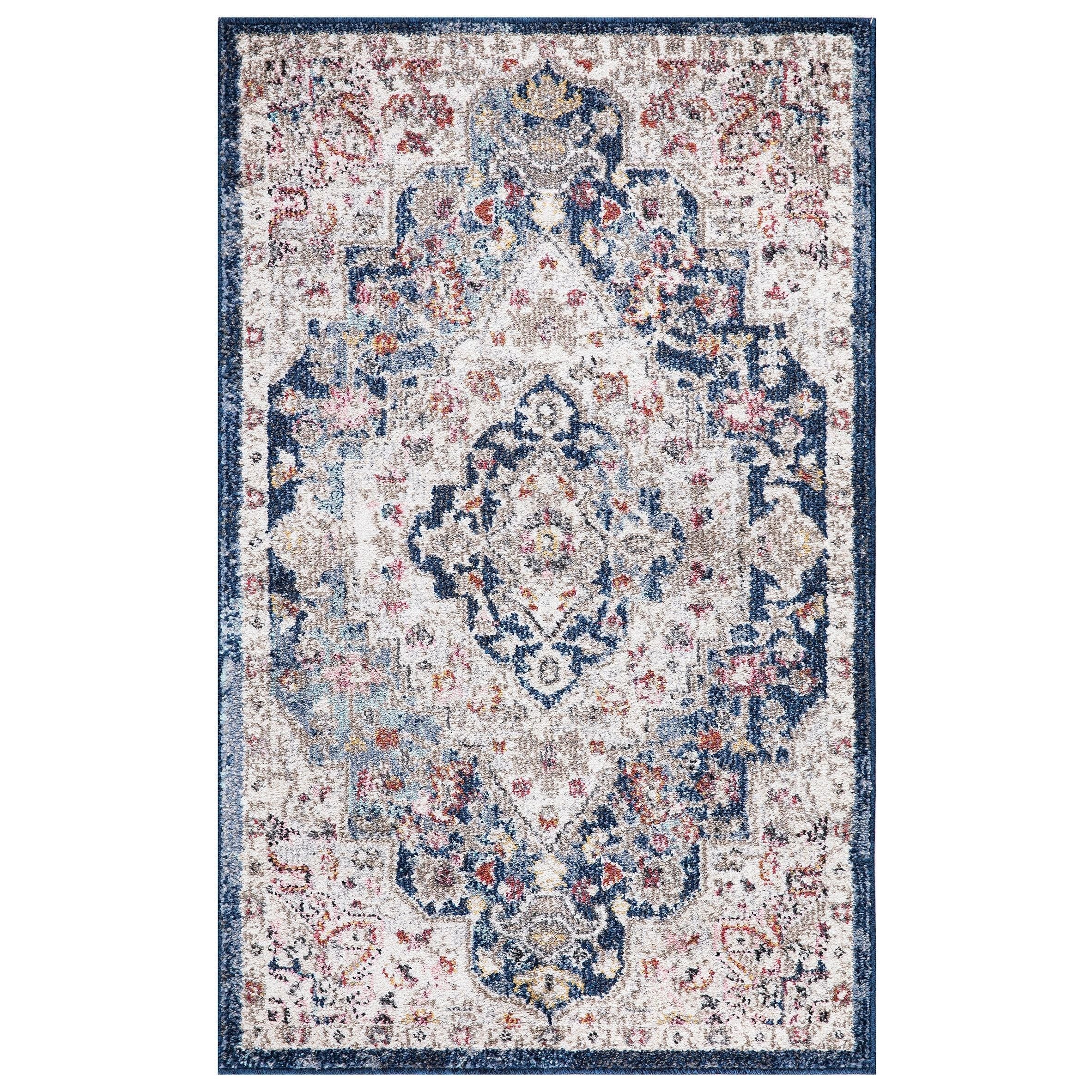 Vintage Montreal Navy area rug from Concord Global, a stunning addition to your home decor. Crafted from durable olefin yarns, this rug boasts a unique distressed style that is all the rage in today's fashion world. Whether you're looking to add a touch of elegance or a pop of color, this versatile rug is available in various sizes and shapes to suit your needs perfectly.