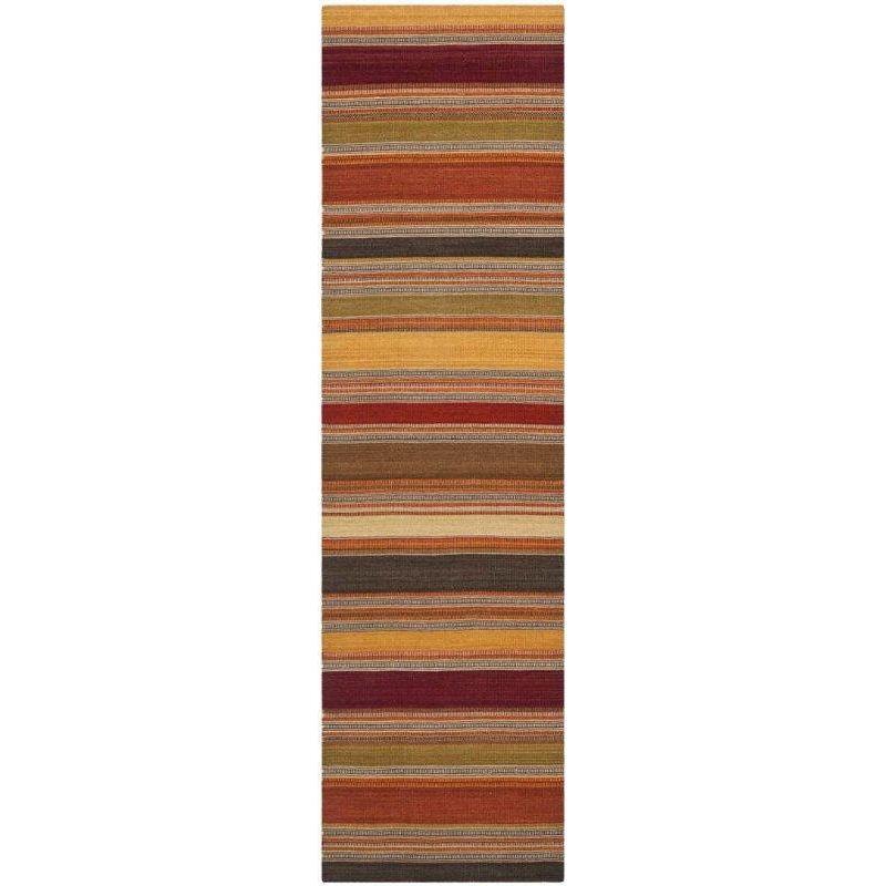Striped Kilim STK315A, a stylish addition to our flatweave rug collection. The warm and inviting color palette of each stripe effortlessly blends various design styles found in Western and California decor. From Arts & Crafts to Navajo influences to transitional furnishings, these rugs bring a versatile touch to any space.