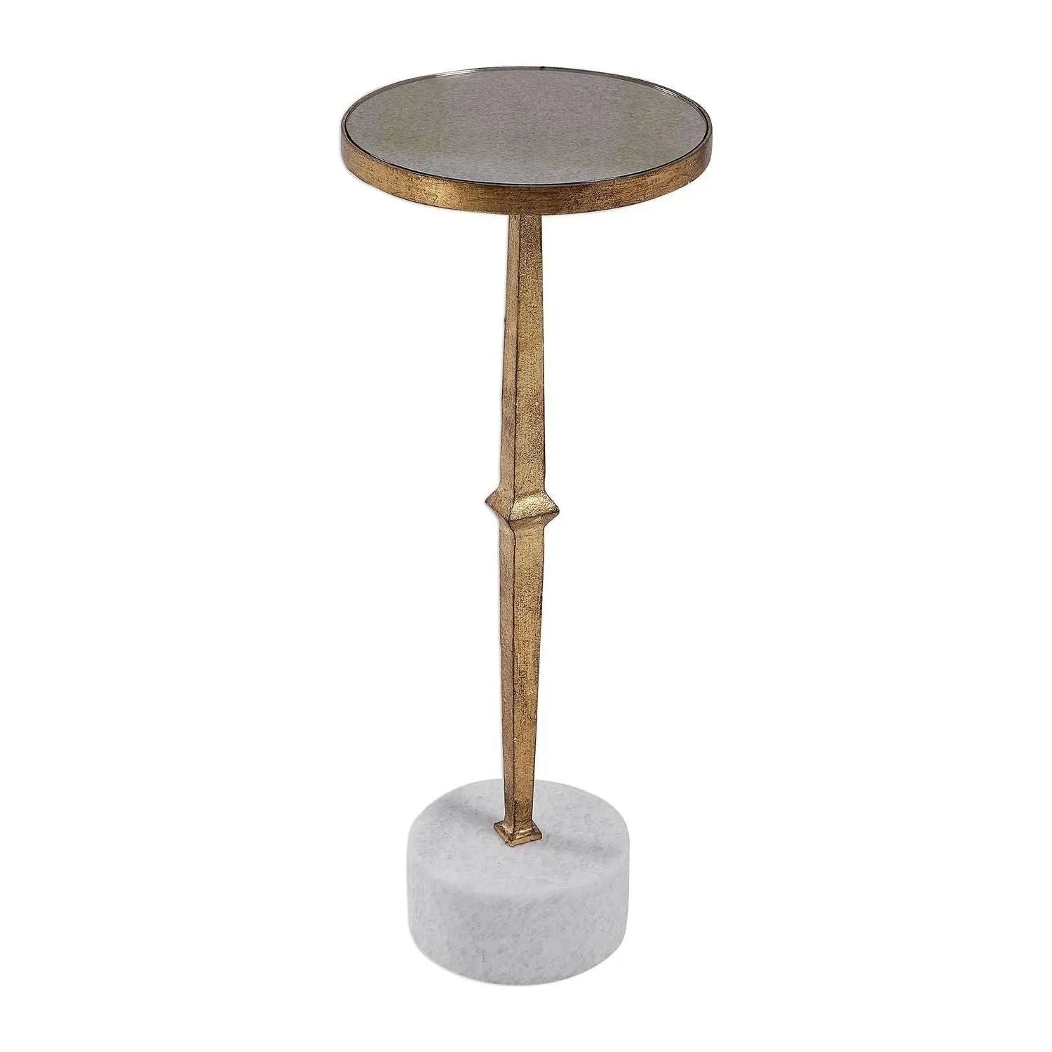Featuring A Cast Iron Construction, This Drink Table Is Finished In Antique Gold And Topped With A Round Antique Mirror. A Considerable White Marble Base Adds Understated Elegance.