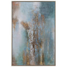 This Hand Painted Abstract Artwork Features A Largely Blue And Green Canvas Accented By Shades Of White, Terra Cotta, Taupe And Gold Leaf With Noticeable Texture. A Silver Leaf Gallery Frame Accents The Piece. Due To The Handcrafted Nature Of This Artwork, Each Piece May Have Subtle Differences. This Piece May Be Hung Horizontal Or Vertical.