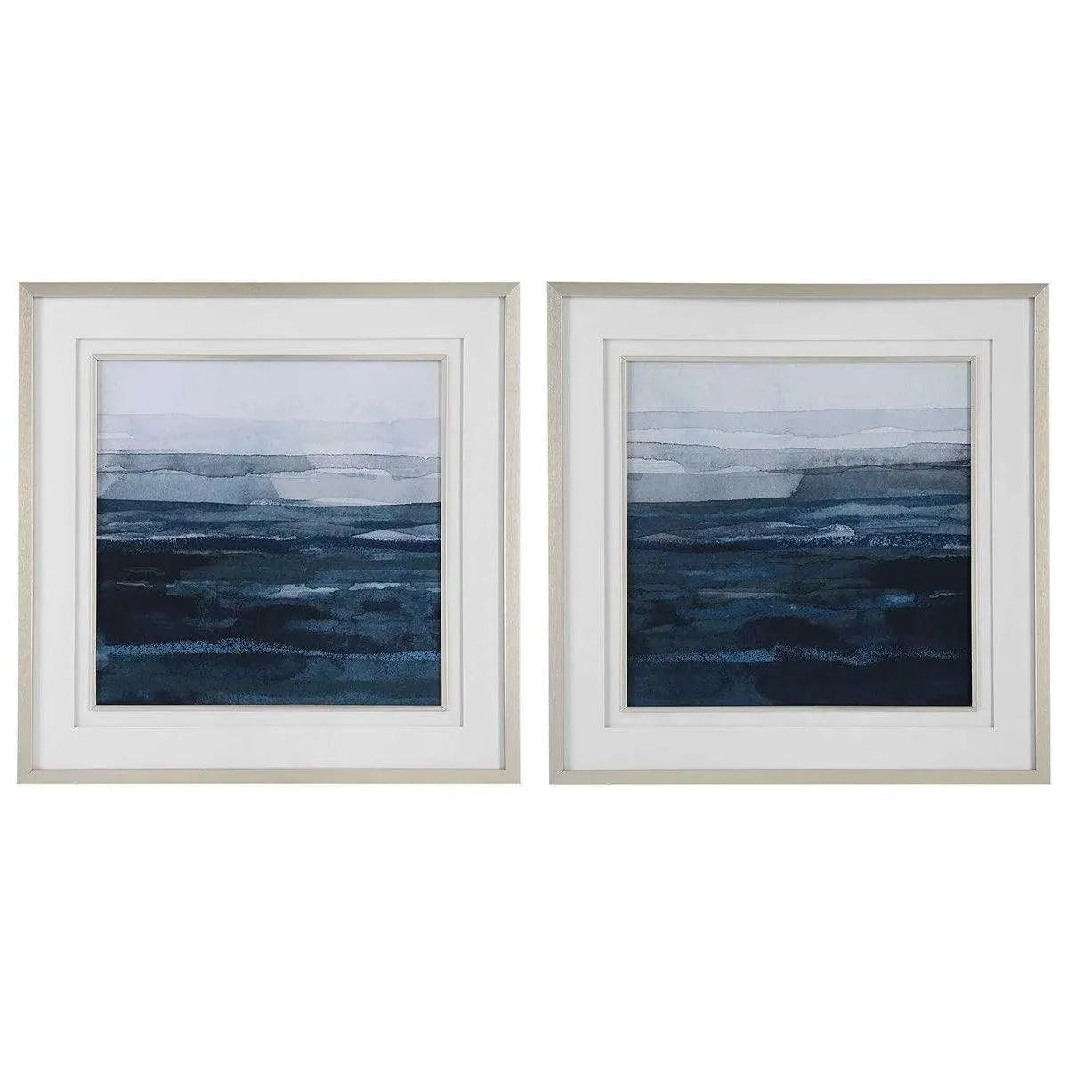 The Rising Blue Artwork Displays Elegance And Style, With Abstract Cobalt Watercolors Accentuated By Double White Matting And Soft Brushed Gold Finished Frames. Prints Placed Under Protective Glass. Artwork By Victoria Borges.