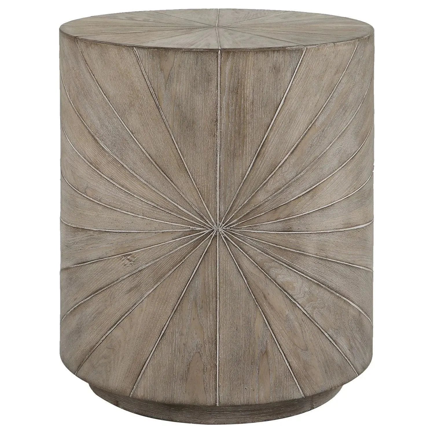 Crafted From Fir Wood Veneer, The Starshine Side Table Features A Starburst Motif Surround Finished In Warm Gray Stain With Light Cerusing That Accentuates The Natural Wood Grain.