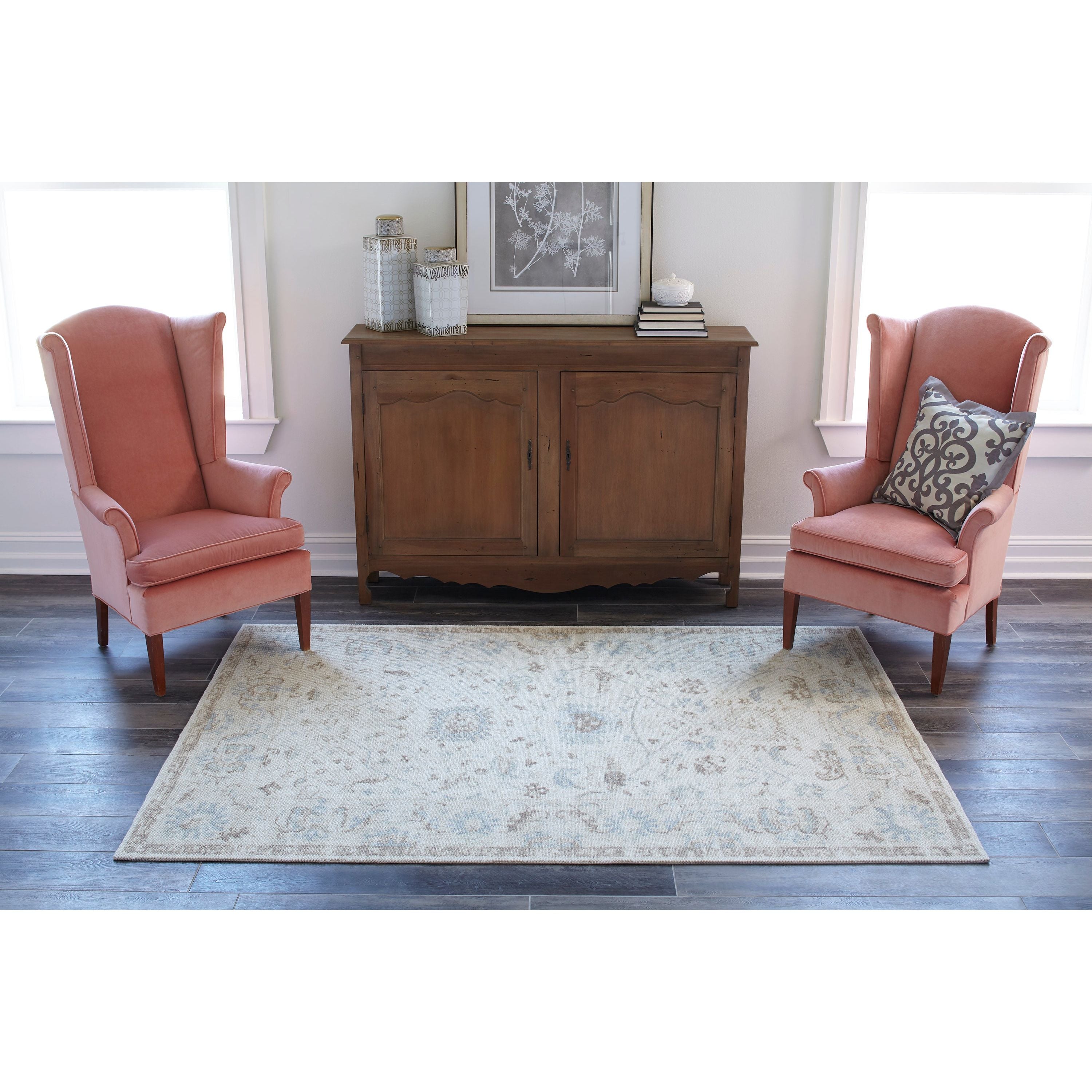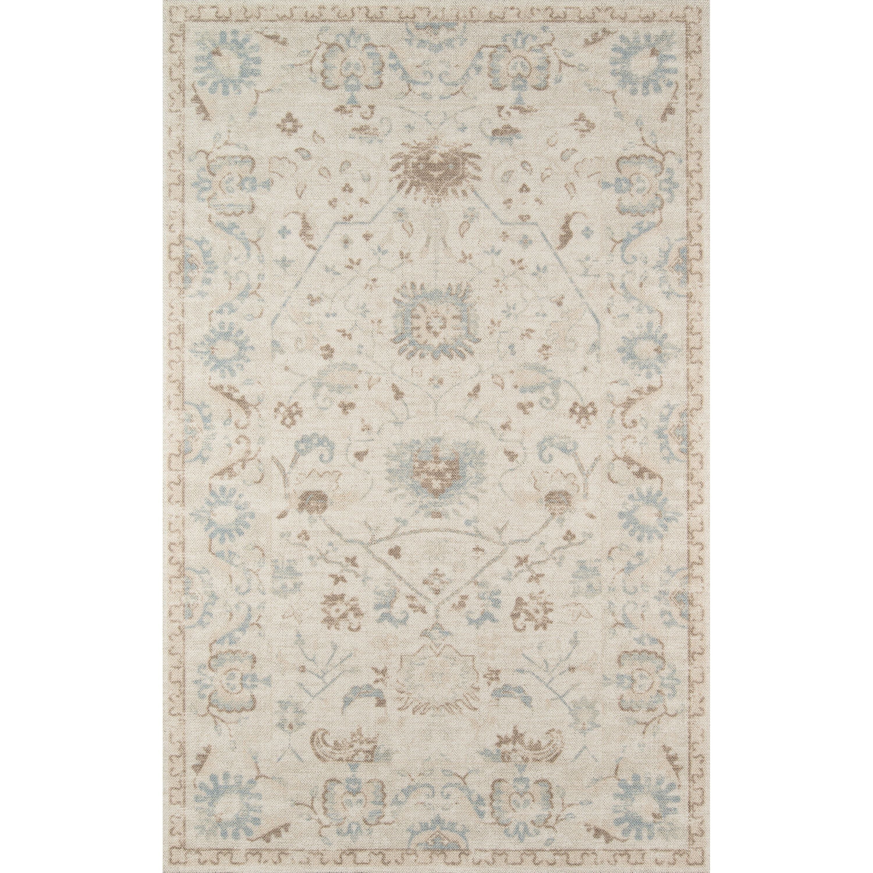 exquisite Anatolia Ana 5 Beige rug from our distinguished collection. Embrace the gentle allure of tribal design with this pastel color palette that showcases shades of pink, baby blue, and brown. The rug features classical medallions, vine motifs, and dot patterns on its field and ornamental borders for a touch of elegance.