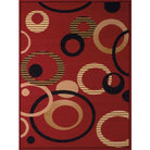 Dallas Hip Hop Red rug, a striking addition to elevate your space. The circular geometric design in vibrant scarlet red, jet black, and tan-brown hues makes this rug a standout statement piece in any room. Crafted from high-quality polypropylene with a sturdy jute backing, this machine-made rug promises long-lasting color and durability.