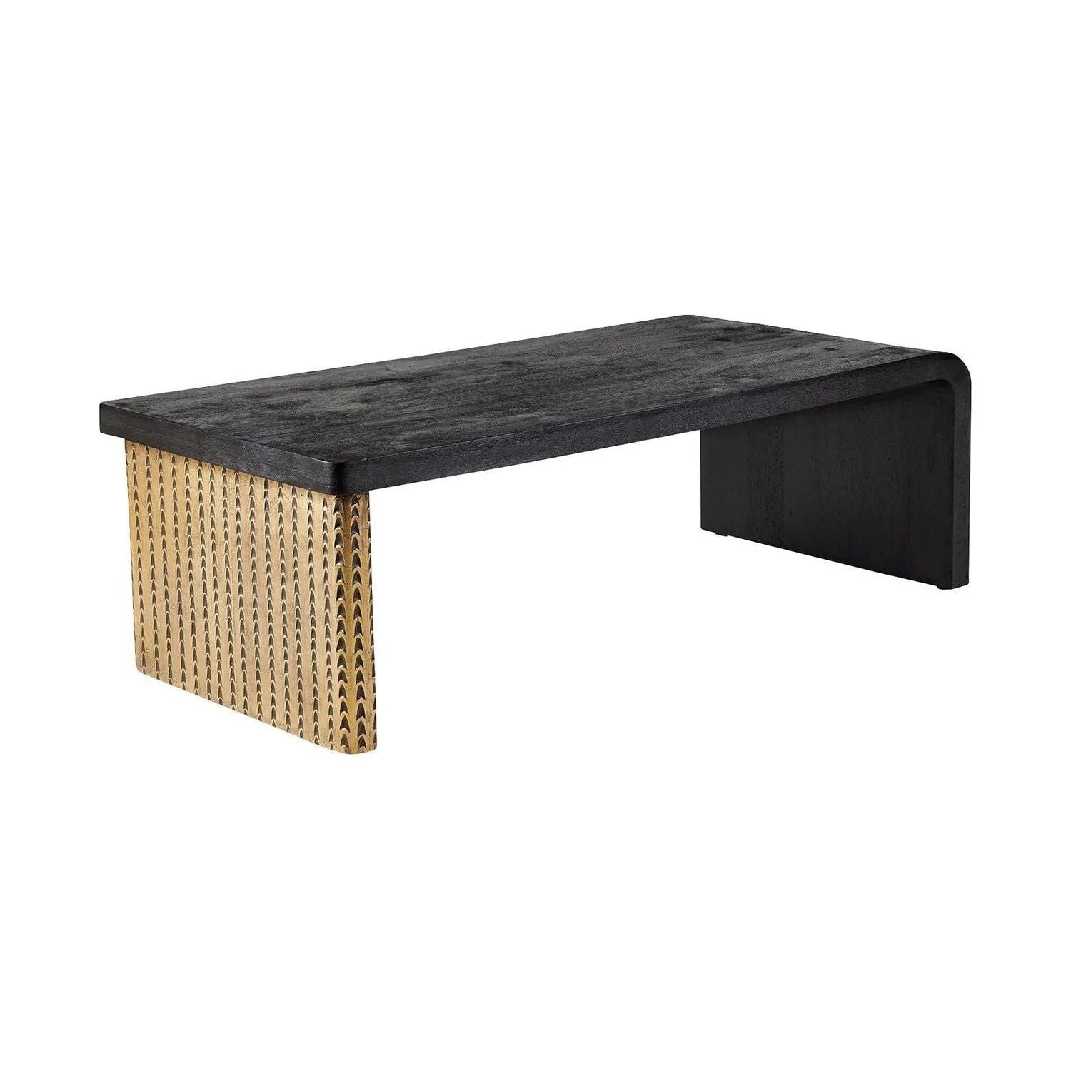 Curved lines and textural details lend a partial waterfall effect to a simple form. Pairing ebony mango wood with a contrast sled leg, the elongated silhouette possesses an upward momentum. Accented with details of feather-like antique brass clad. Finish will vary.