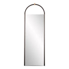 The Shelvin floor mirror unites graceful lines with handsome finishes. The mirror is designed with an arched graphite leather and blackened bronze steel frame with an antique brass accent on top, reminiscent of a delicate arbor, which creates a relief for the mirror set inside. The mirror is fitted with a security cleat for hanging vertically. Leather may vary.