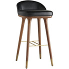 Form meets function as modern meets traditional with this bar stool. The black leather seat lends a contemporary touch to the traditional style of the solid walnut-finish wood legs while an antique brass stretcher adds support and acts as an accent to the dark fa?ade. Featuring a low back and no arms the minimalist profile of this piece makes it ideal for tucking under a counter. Finish and leather may vary.