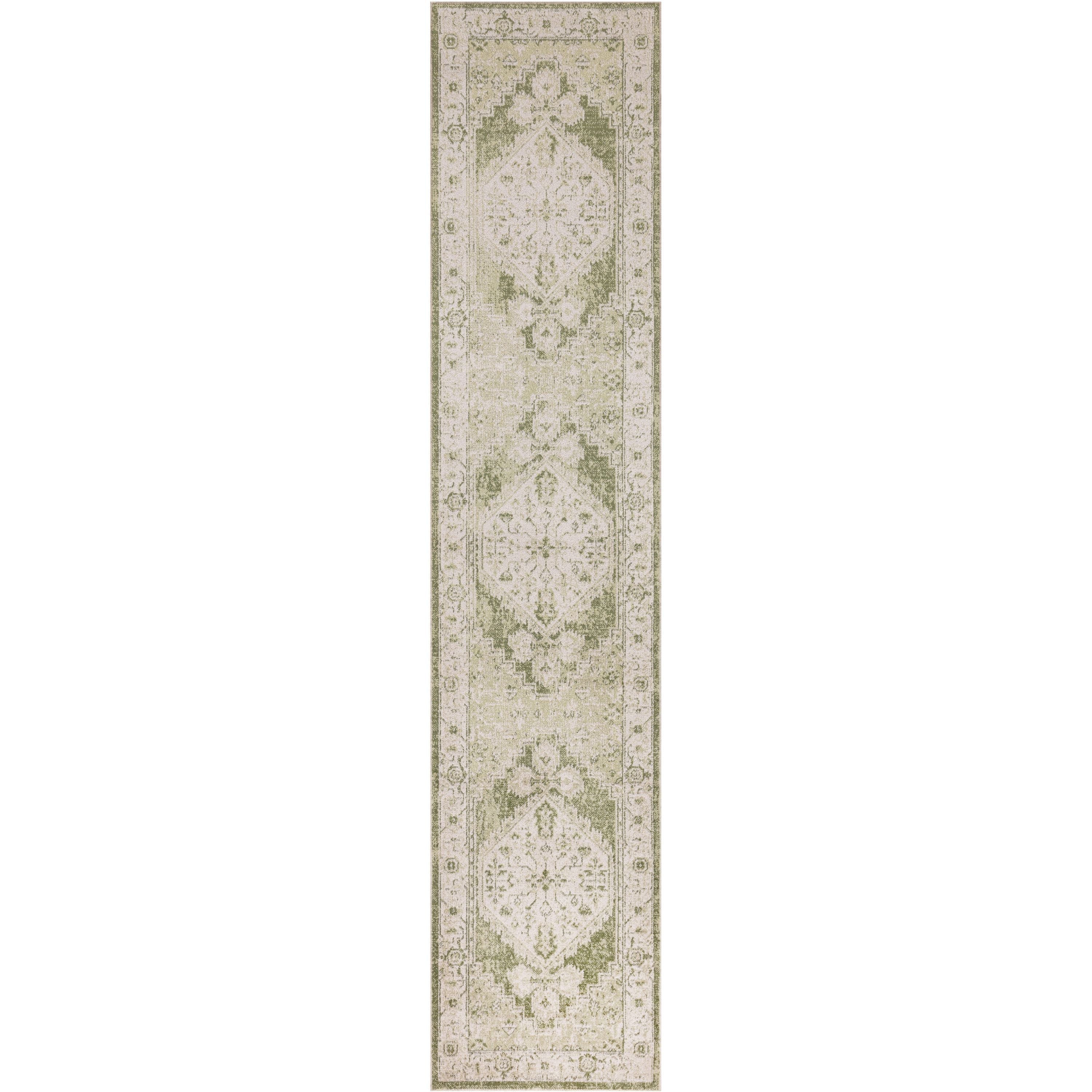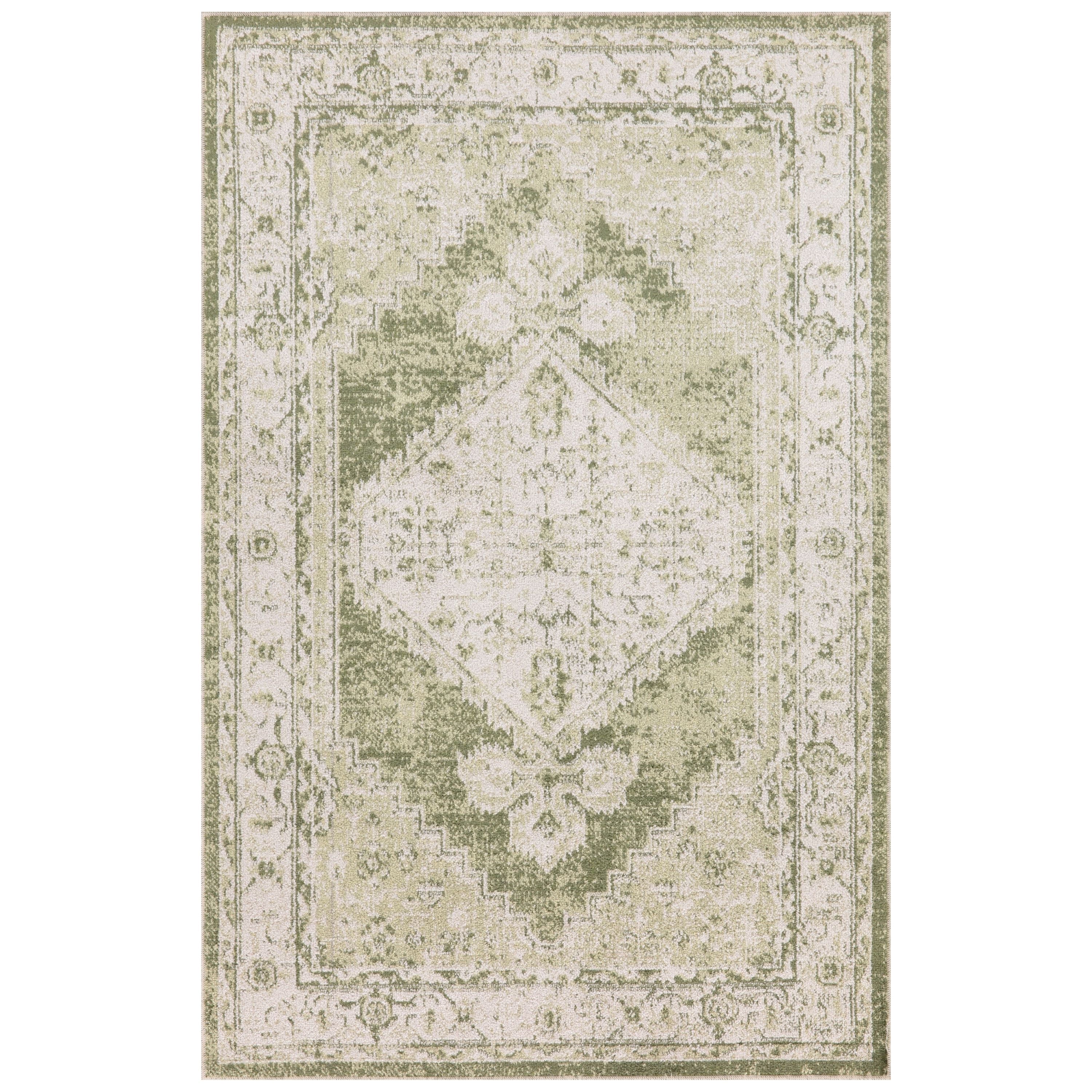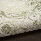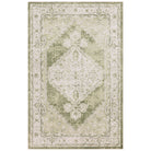 Astra Machine Washable ASW11 Ivory Green rug, a fusion of vintage charm and contemporary convenience. From the Astra Machine Washable Collection, this Persian-style rug showcases a beautifully faded floral medallion motif in elegant ivory and soothing green tones. Its timeless design is elevated with a captivating sheen that plays with light, adding depth to any room.