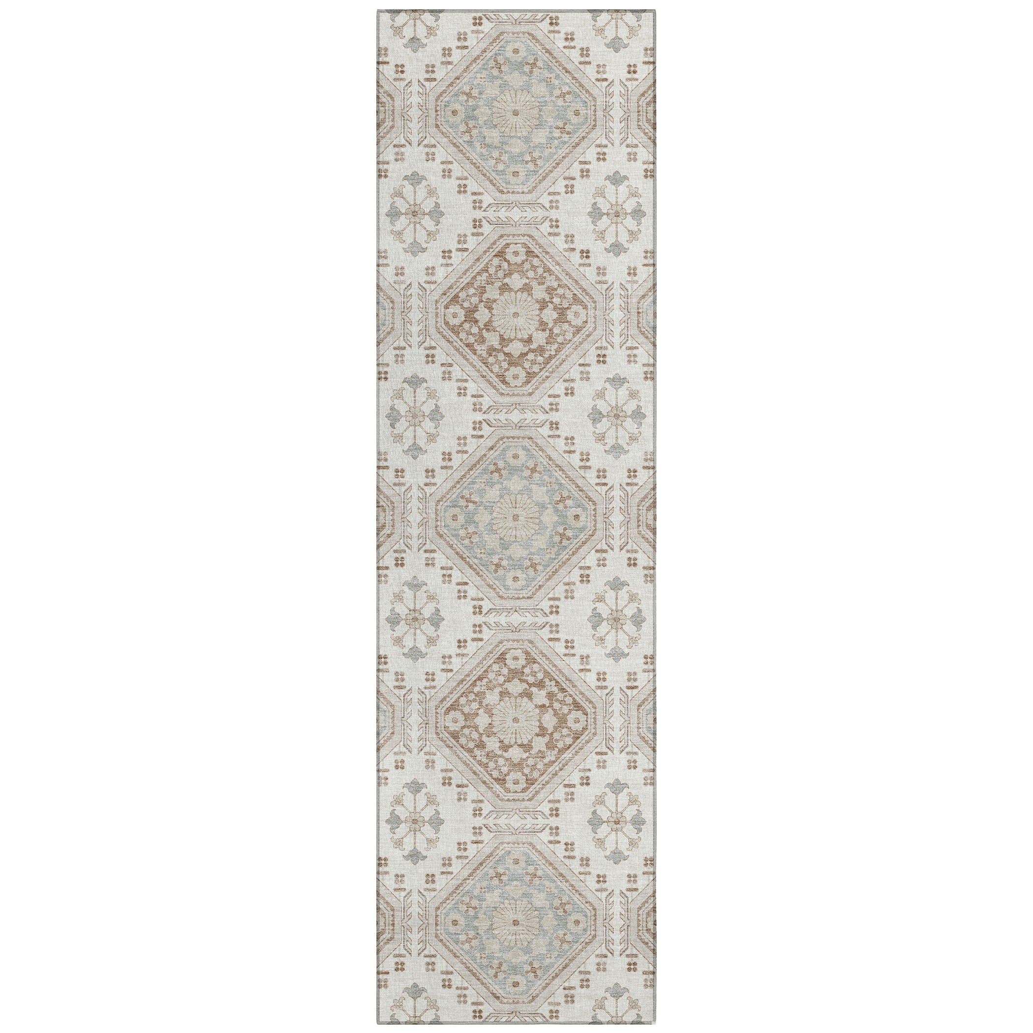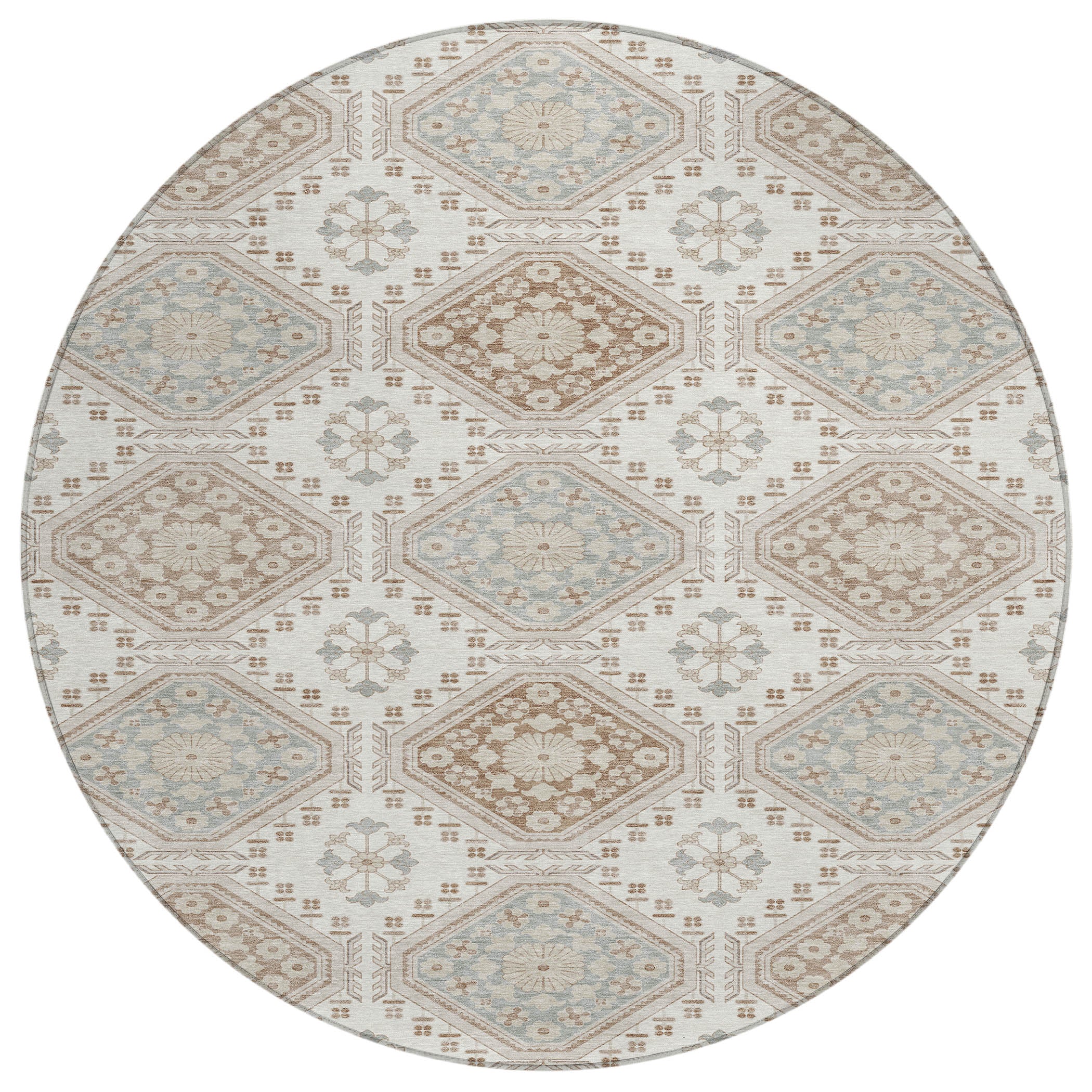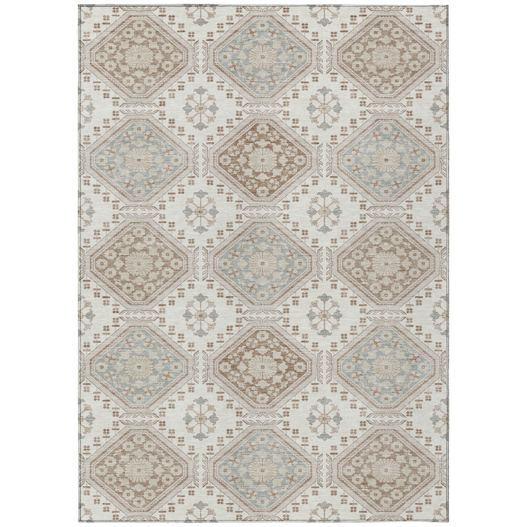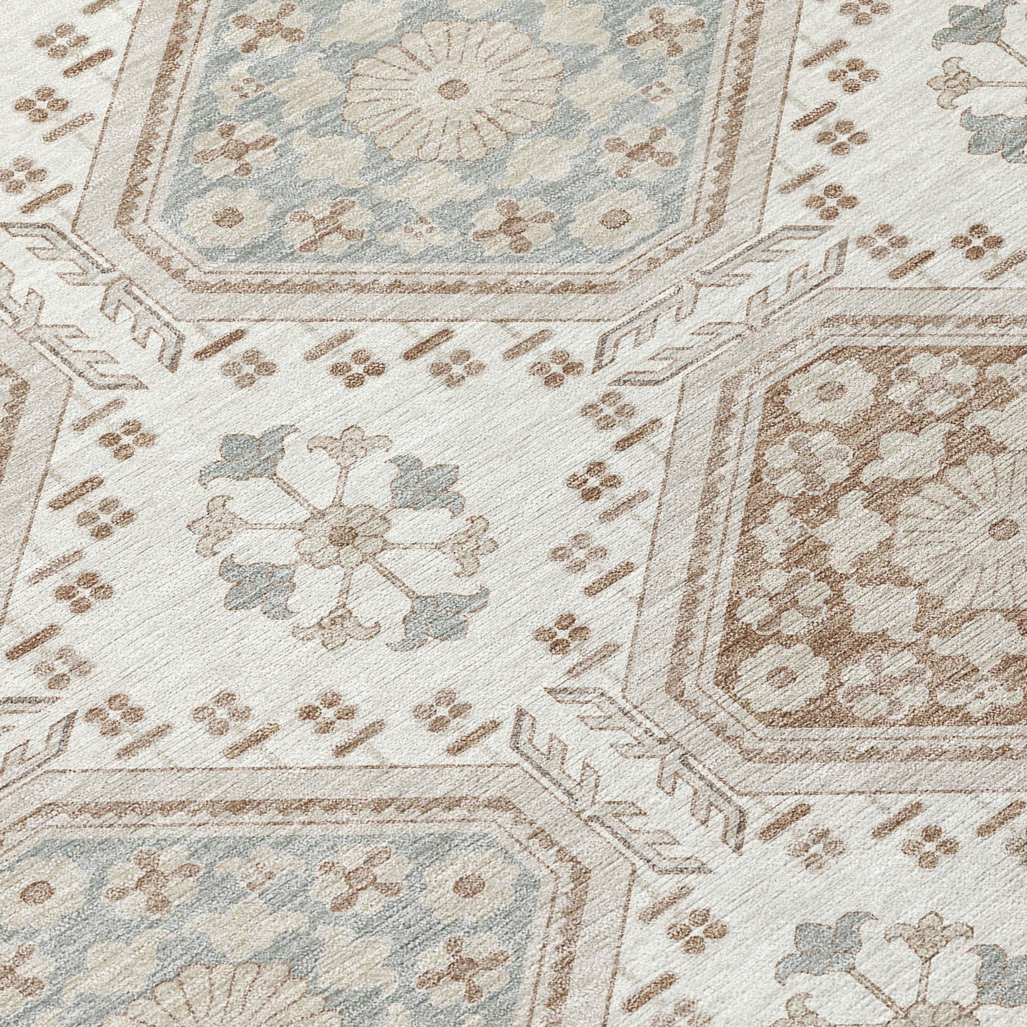 Experience the charm of floral octagon motifs with intricate details in this transitional rug. The formal pattern adds an artistic and refined touch to your decor. UV stabilized for both indoor and outdoor use, it features an ultra-thin construction. This machine-washable rug is family and pet-friendly, ensuring easy maintenance and long-lasting beauty.