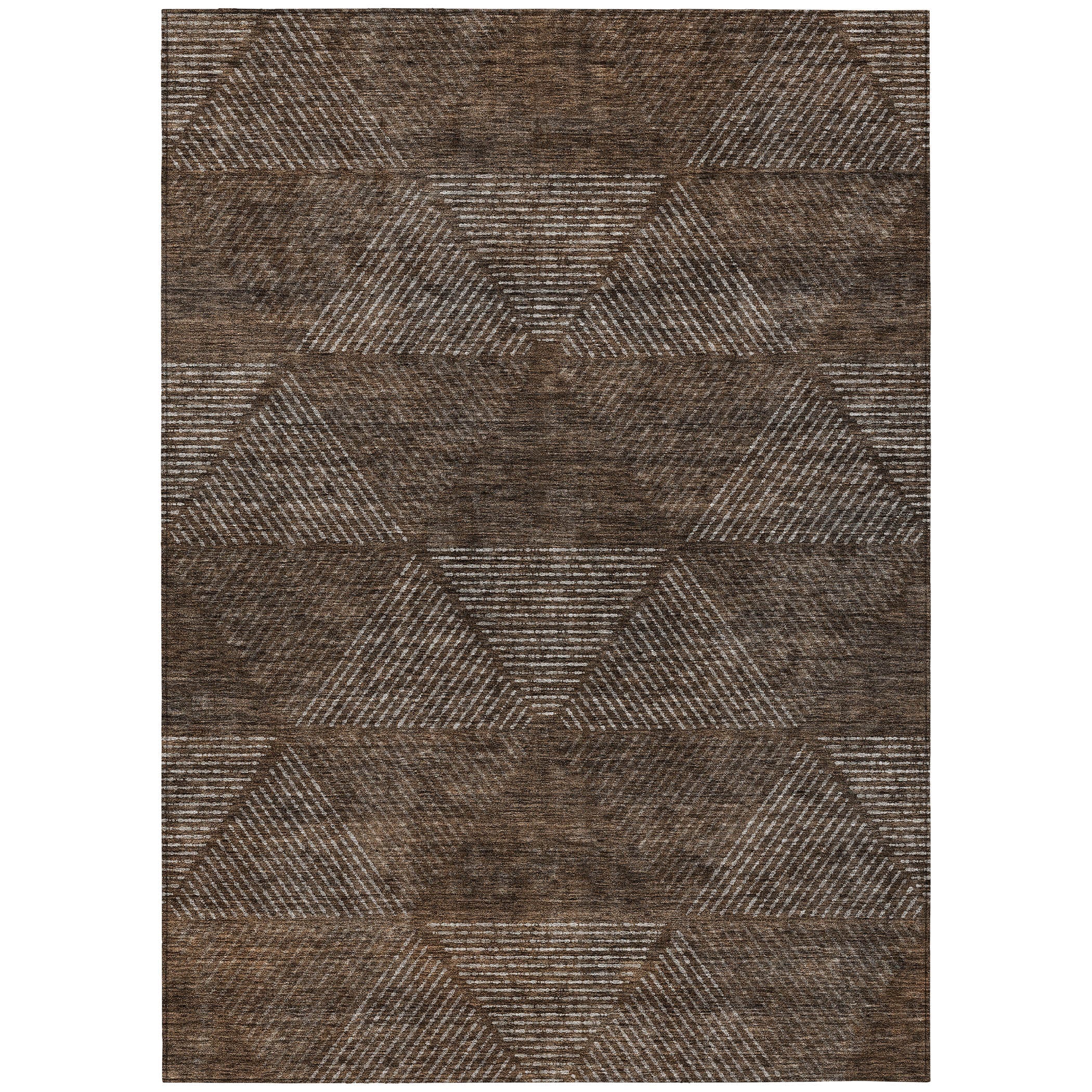 Chantille ACN777 Brown rug, a perfect addition to elevate the style of any transitional space. Its unique design features triangular motifs and horizontal lines, creating a visually stunning geometric pattern that exudes modern sophistication.