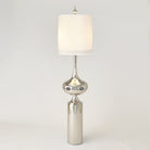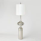 Our Extraterrestrial Table Lamp is out of this world cool! The middle of this shiny silver finished lamp features cutouts that glow with the two bulbs held in the base. A white linen round shade and bulb-shaped final completes this otherworldly look.