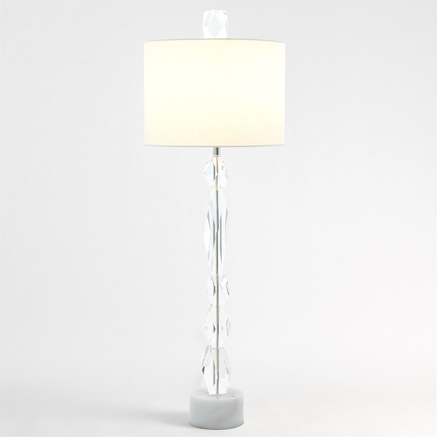 Roger Thomas has collected eccentric faceted rock crystal shapes for 20 years. Stacking them in a delightful column was the inspiration for this design. White marble base and hardback fabric shade.