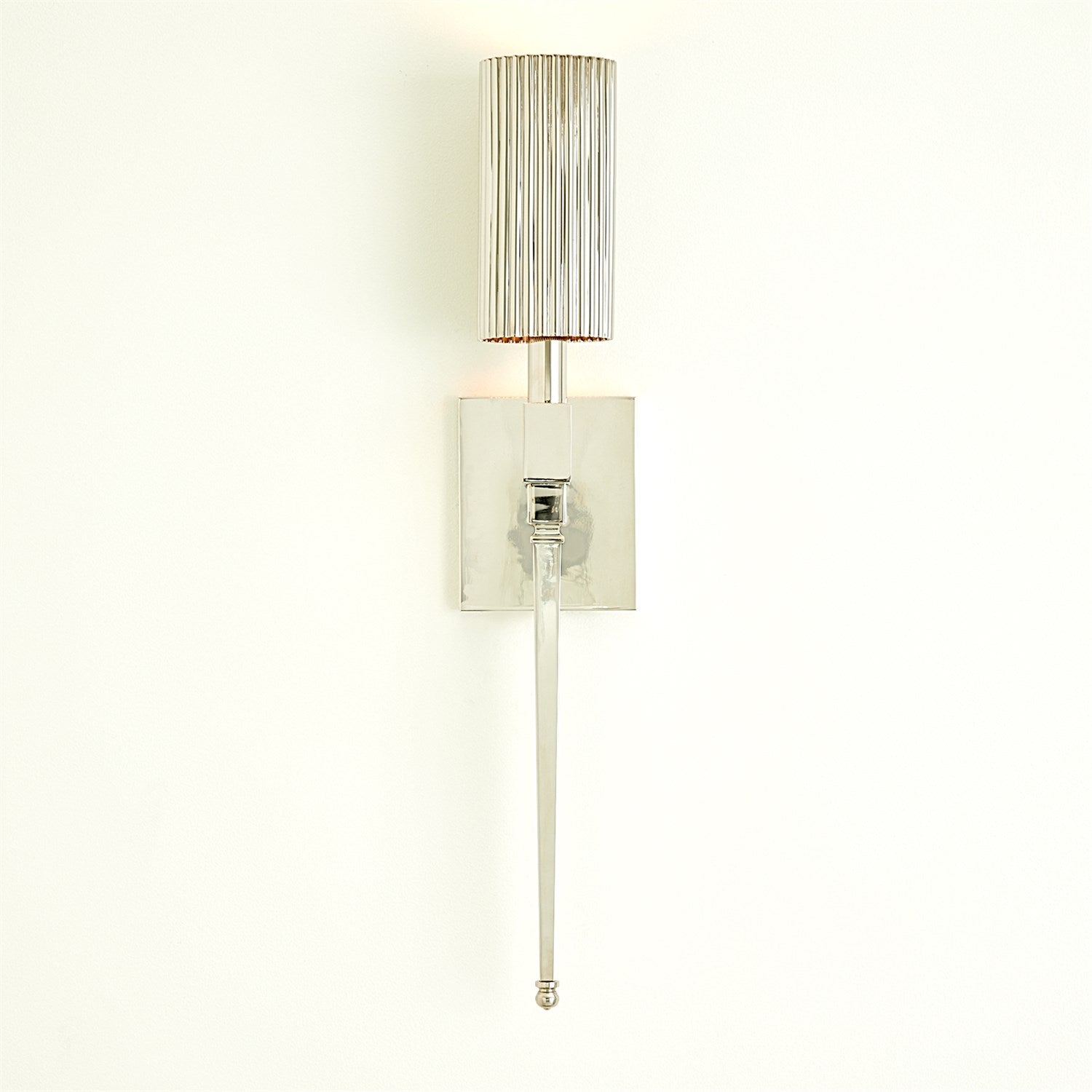The Fluted Single Sconce presents a timeless torchiere silhouette, elegantly crafted from brass with a gleaming shiny nickel finish. Illuminate your space with the perfect blend of classic design and contemporary charm.