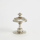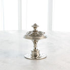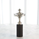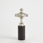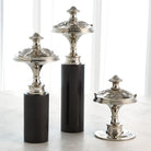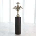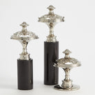 Inspired by a newel post adornment, the sculptures are made of nickel-plated brass. The large and medium sizes sit on black granite bases.