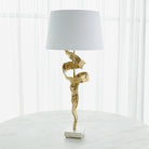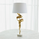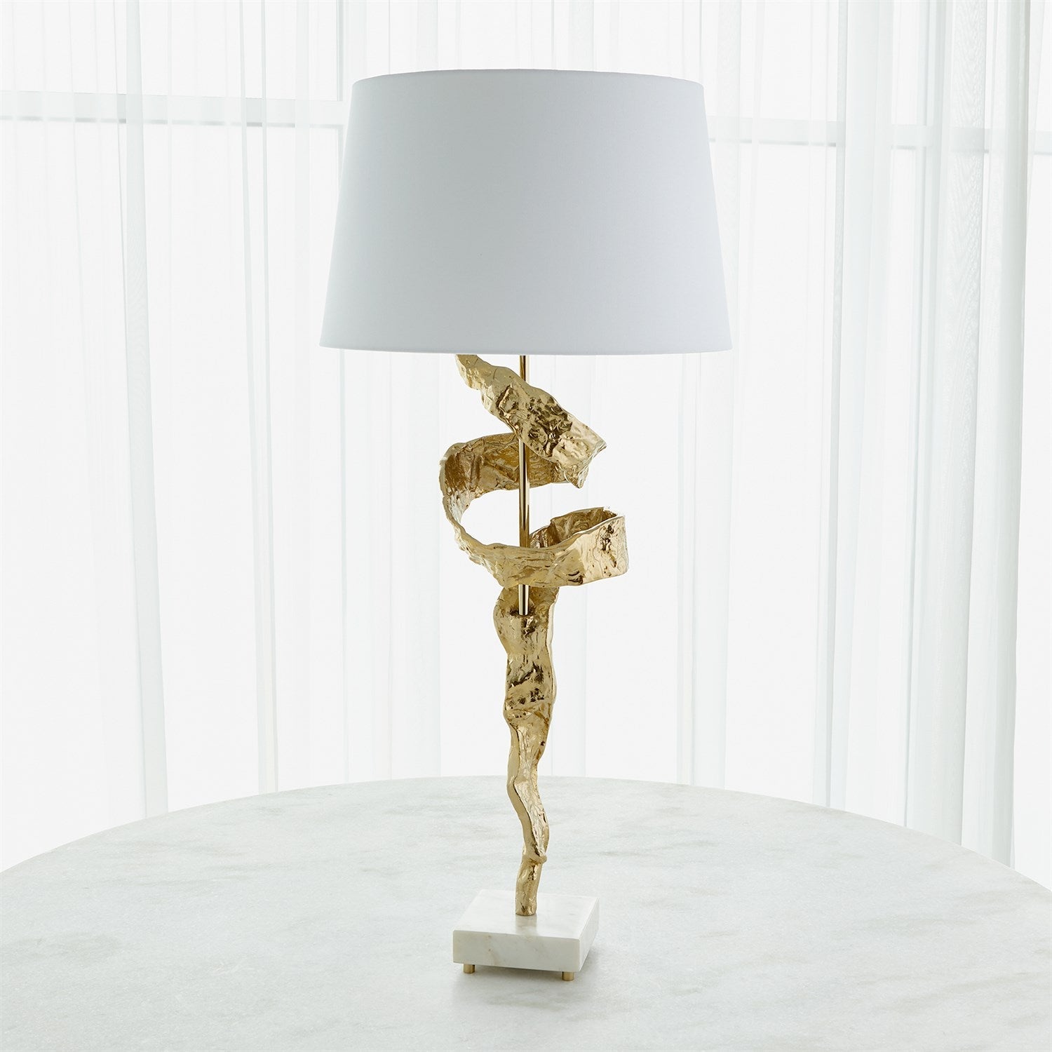 Our Twist Lamp is a large, high-quality statement piece with a shiny brass finish, white marble base, and hardback fabric shade.