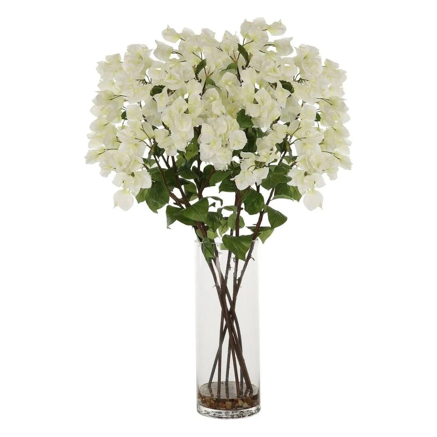 Effortlessly Arranged As If Freshly Cut, These Bougainvillea Branches Exemplify The True Characteristics Of Live Florals. Cream Blooms Are Accented By Natural Rocks In A Clear Glass Vase.