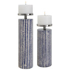 Set Of Two Ceramic Candleholders Are Finished In A Vertically Striped Ivory And Cobalt Glaze, Accented By Iron Candle Cups Finished In Polished Nickel With Two 4''x 3'' Distressed Off-white Candles Included. Sizes: S-4x14x4, L-4x17x4
