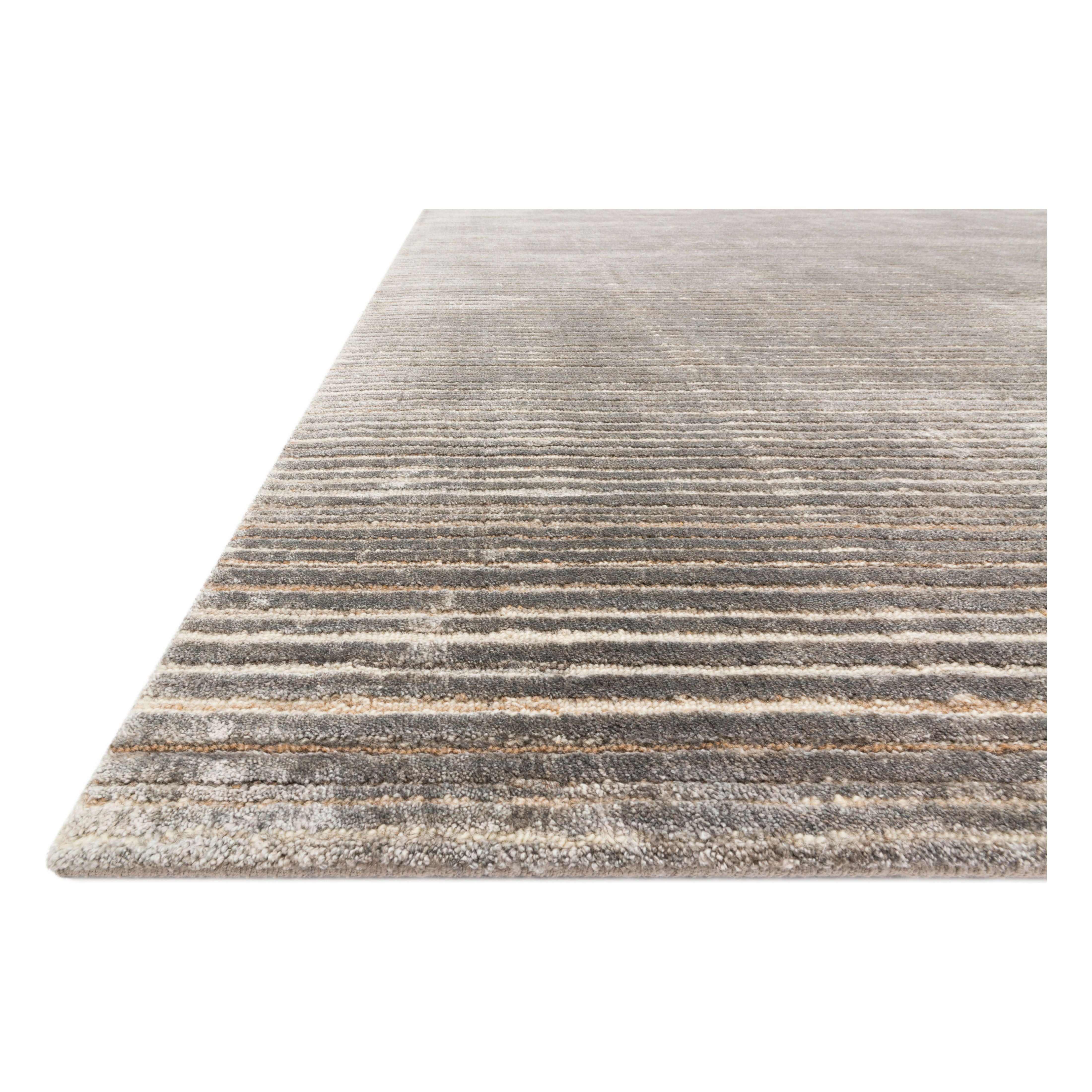 Bellamy Bel 01 Grey, a stunning addition to any room. Hand-loomed in India by skilled artisans, this collection features a blend of viscose, wool, and culpro for a luxurious feel. The Bellamy rug's silky texture, tonal colors, and contrasting pile-height stripes bring a dynamic element to your space.