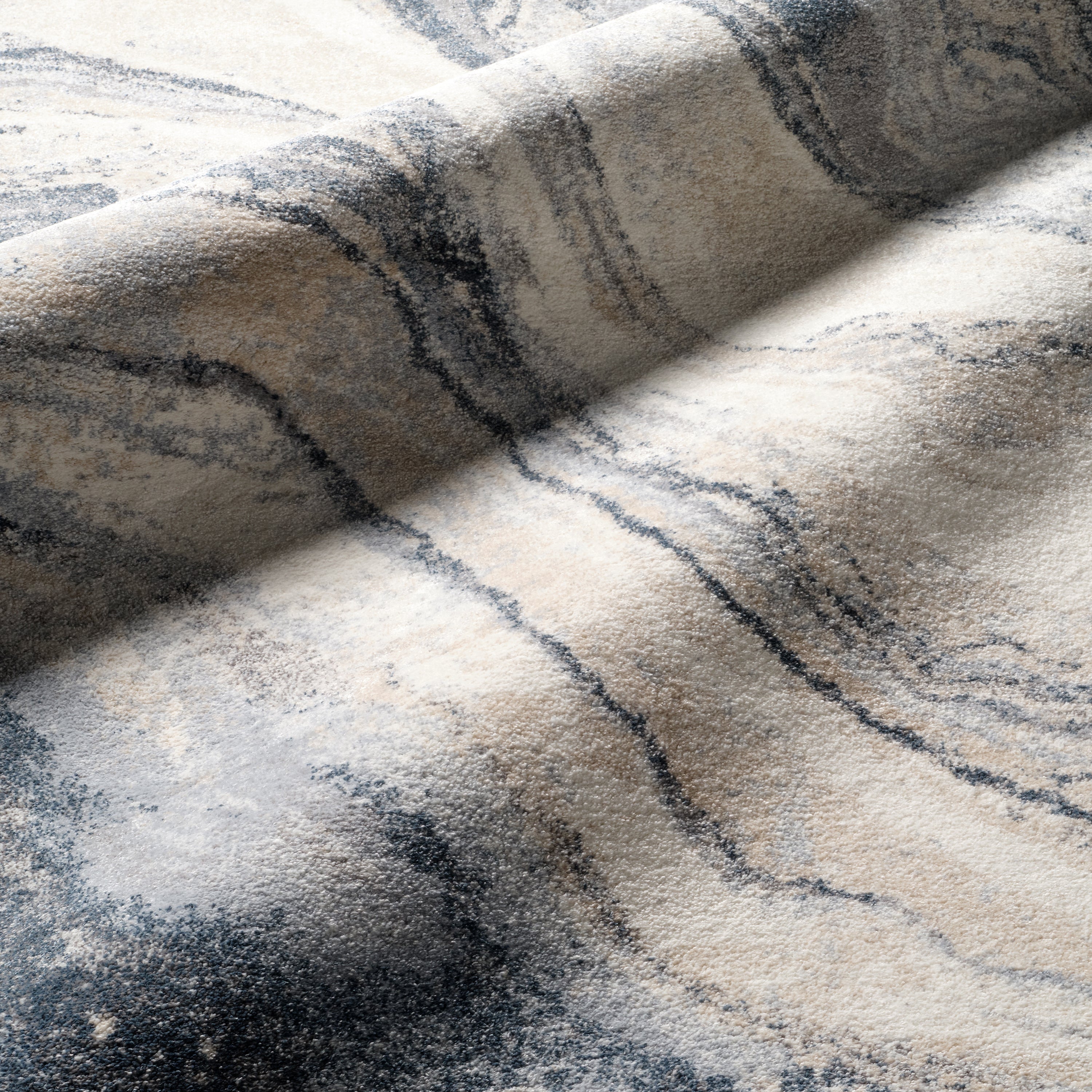 Serene hues and industrial style meld together to define the fresh, contemporary appeal of the Ferris collection. The Orion design features an agate-inspired abstract motif in tones of blue, gray, ivory, and hints of warm beige. This plush rug boasts added texture with carved, high-low details throughout the durable polyester and polypropylene pile.