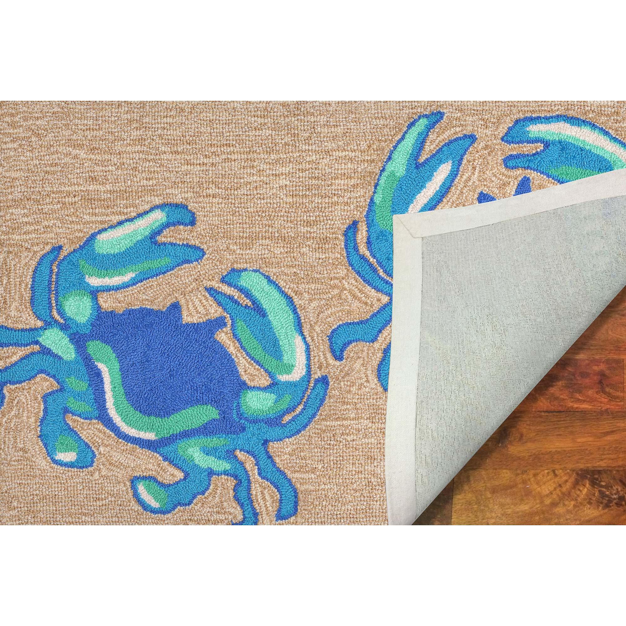 Frontporch Crabs Blue mat, a charming addition to any beach lover's décor. This ocean-inspired piece features a playful novelty design with richly blended colors that will bring a touch of seaside joy to your home. Hand-hooked using weather-resistant fiber, this collection offers a perfect combination of comfort, softness, and durability.