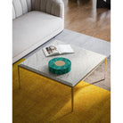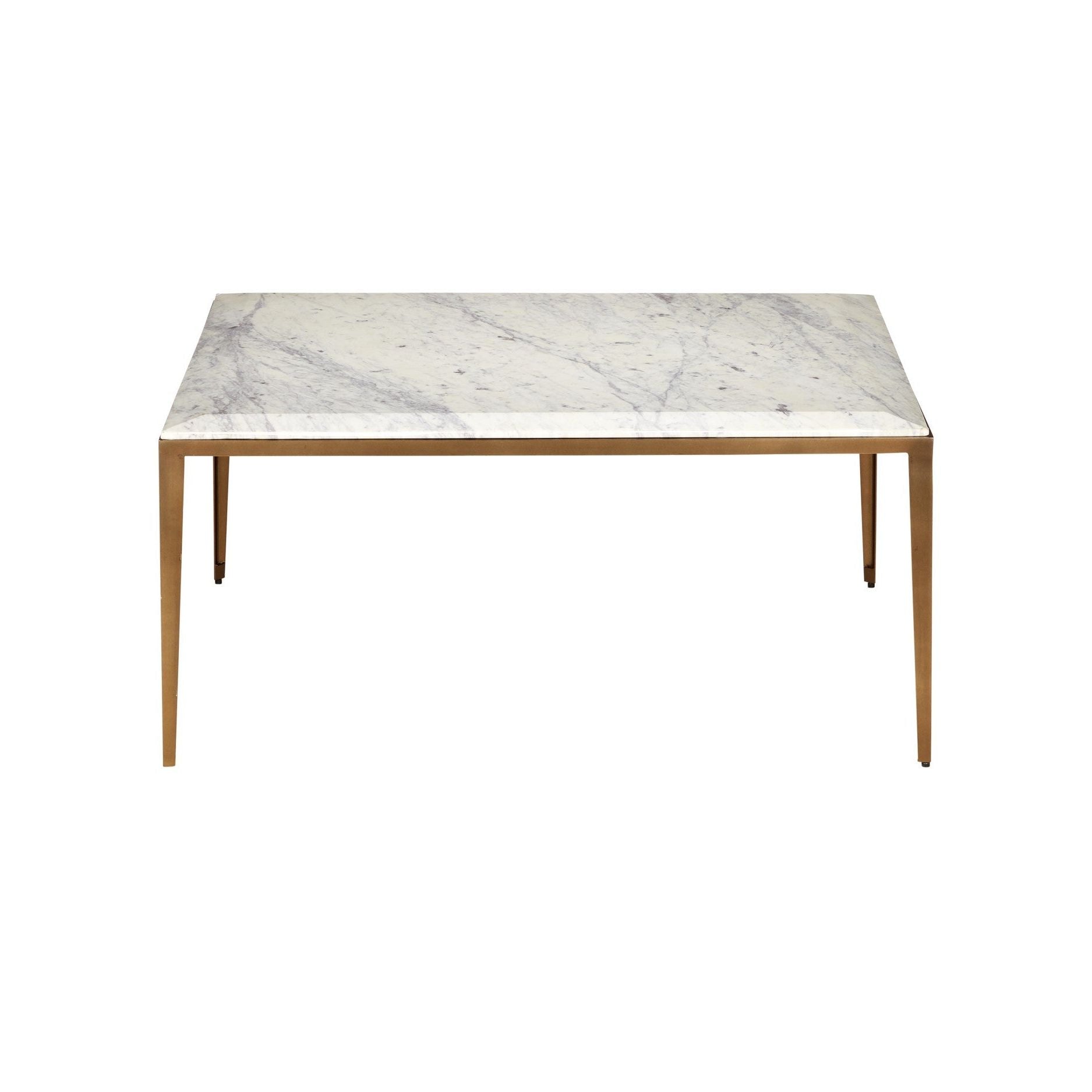 The Oblique Marble Cocktail Table has tapered legs and a sleek frame crafted from metal in an antique brass finish. The chamfered top, made of white lilac marble with delicate veining, sits slightly above the frame, creating a subtle floating effect. This refined detail enhances the table's visual depth. Because the stone is a natural material, the veining will vary slightly from table to table.