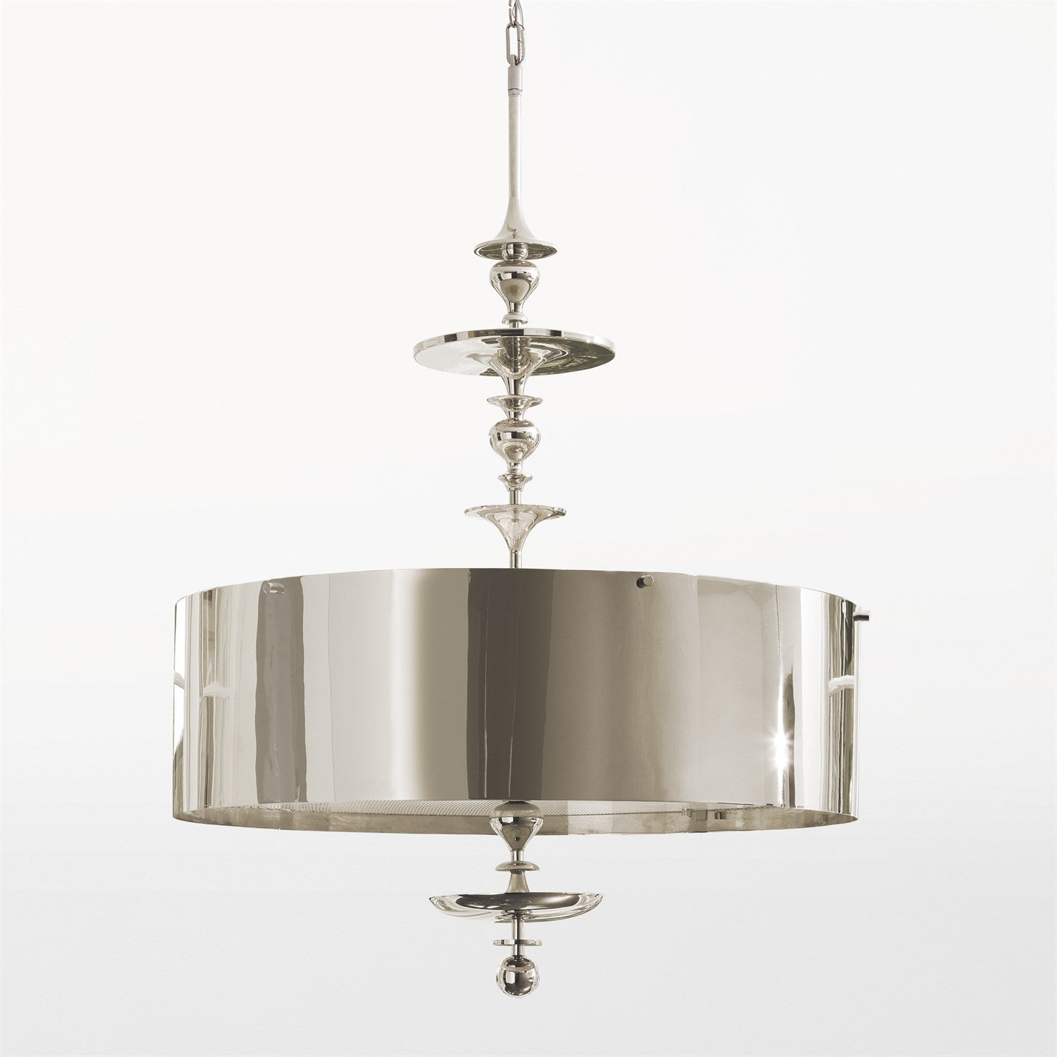 Bring a touch of airy elegance to any room with our Nickel Turned Pendant Chandelier. This pendant features a round drum nickel-finished steel shade and a white perforated metal diffuser for beautifully clear ambient lighting. Available in two sizes.