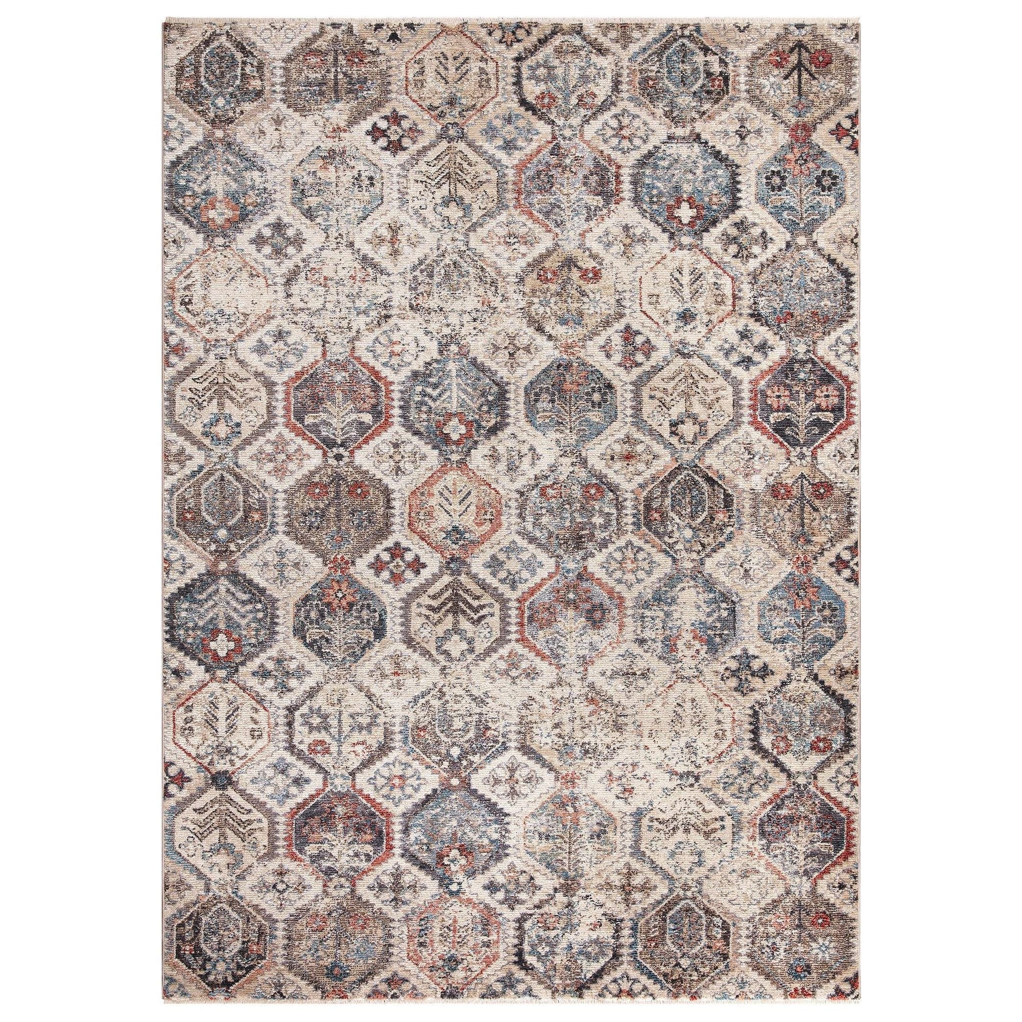 Pandora Moroccan Tiles Multi area rug, a stunning addition to any home decor. Crafted with the finest wool-like woven material, this rug exudes elegance and charm. Its warm colors and plush texture create a cozy atmosphere that complements various styles such as vintage, shabby chic, farmhouse, and boho. The short fringe adds a touch of sophistication to the overall design.
