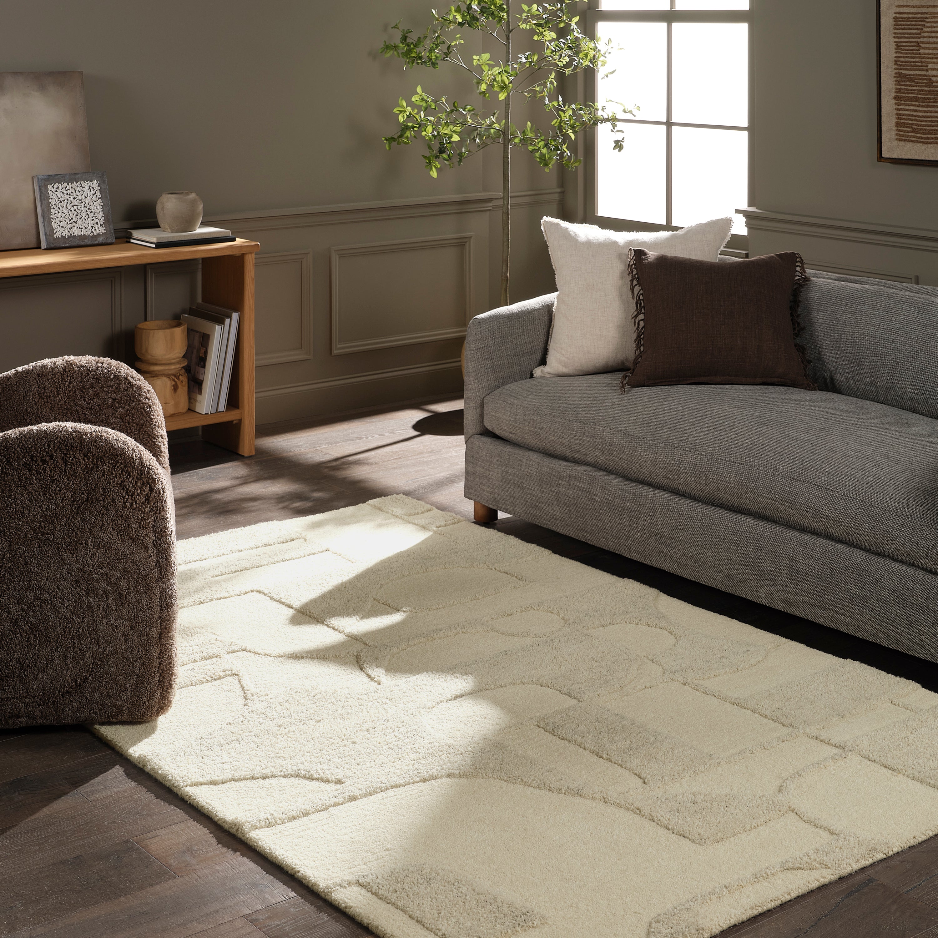 Add a contemporary flair to floors with the Reyner collection. Hand-tufted from 100% handspun, undyed wool, the plush rug features a high-low pile that accentuates its mid-century, Brutalist-inspired geometric pattern. Easy-to-match shades of tan and taupe to add warmth and depth to any interior.