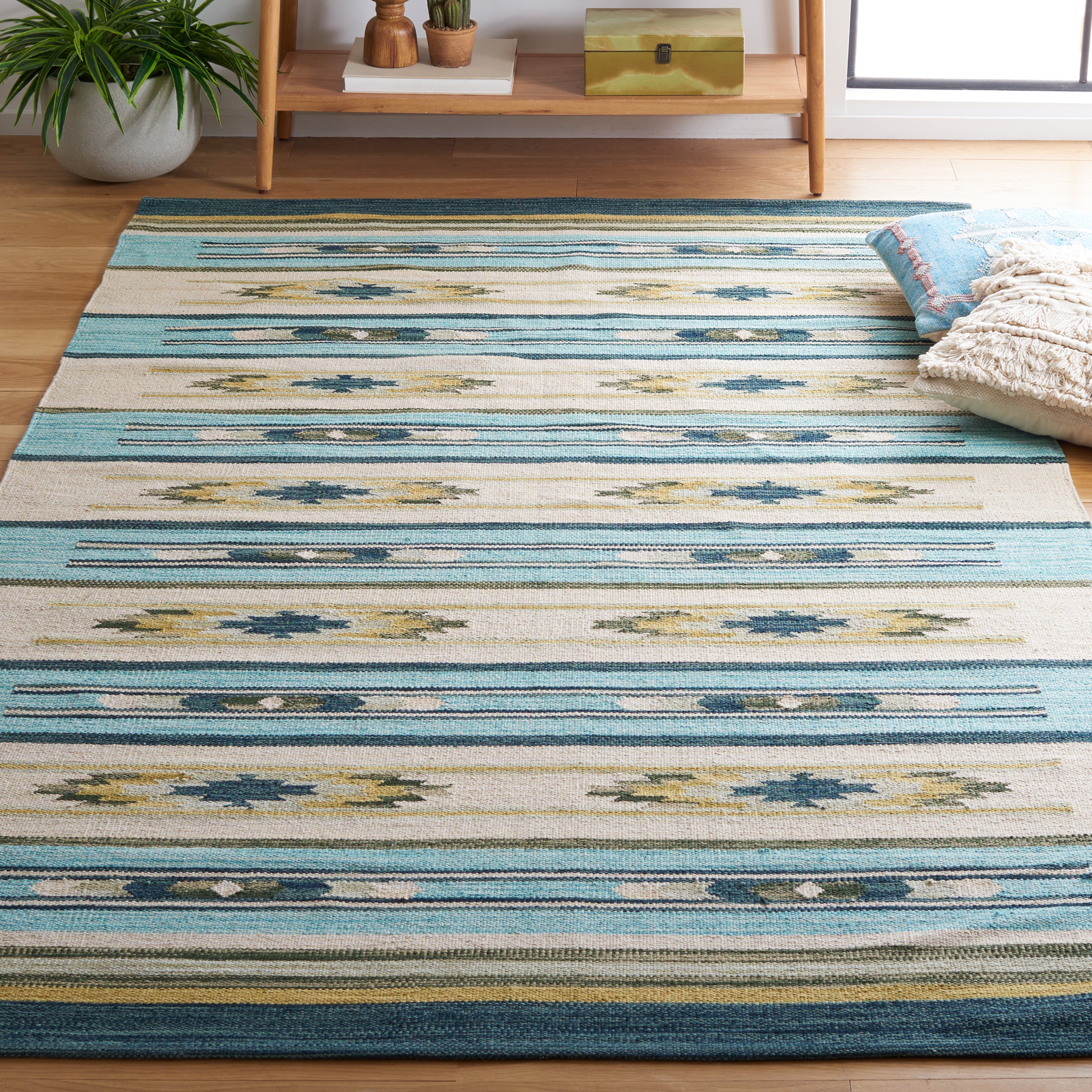 Discover the essence of nomadic and village weaving traditions with SAFAVIEH's Cotton Kilim KLC301J from the Kilim Collection. This rug blends contemporary and tribal-inspired designs, capturing the spirit of the Middle East and Central Asia. With a sleek flat-weave construction, this rug boasts a thickness of approximately 0.25 inches, adding texture to your space.