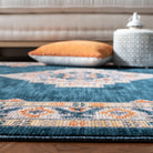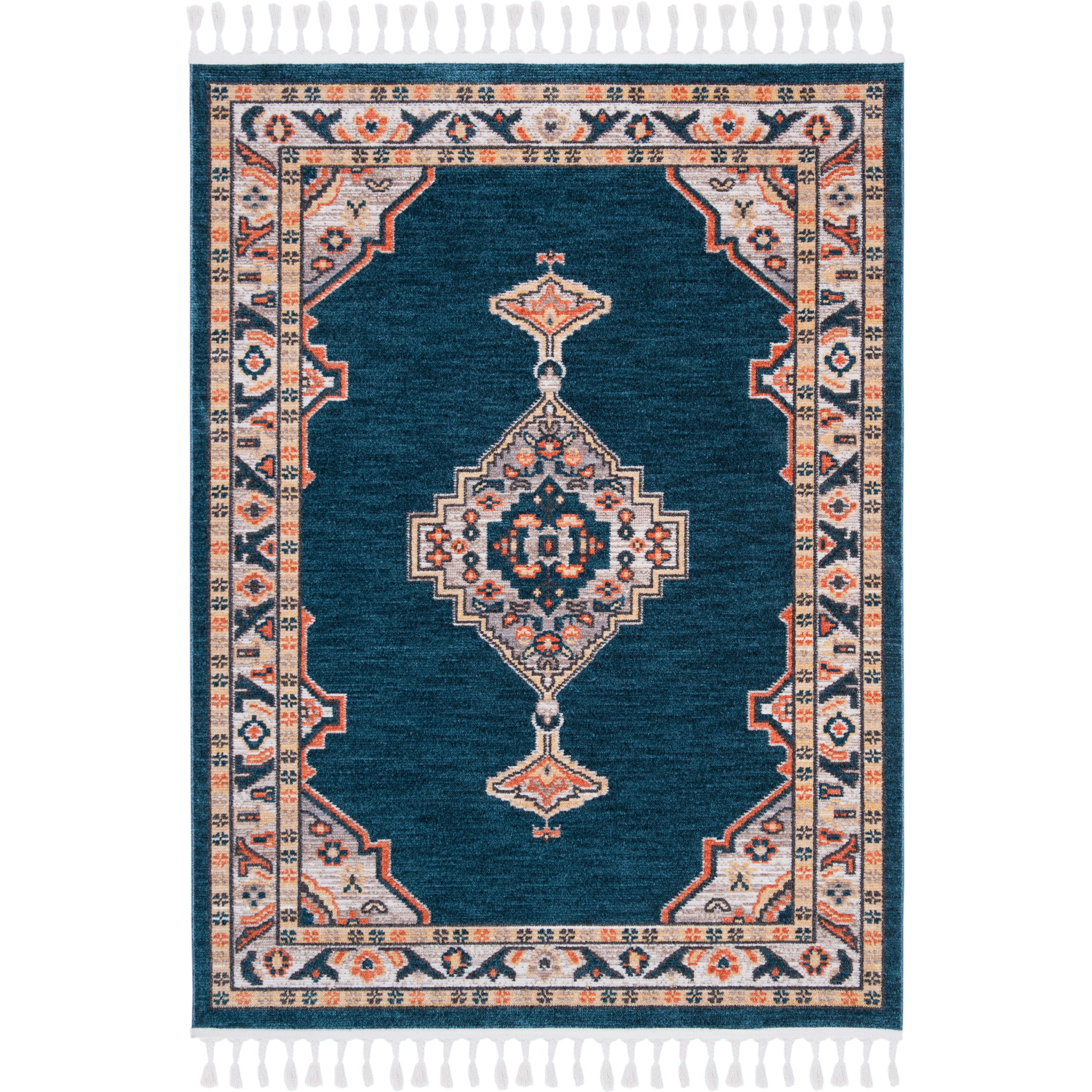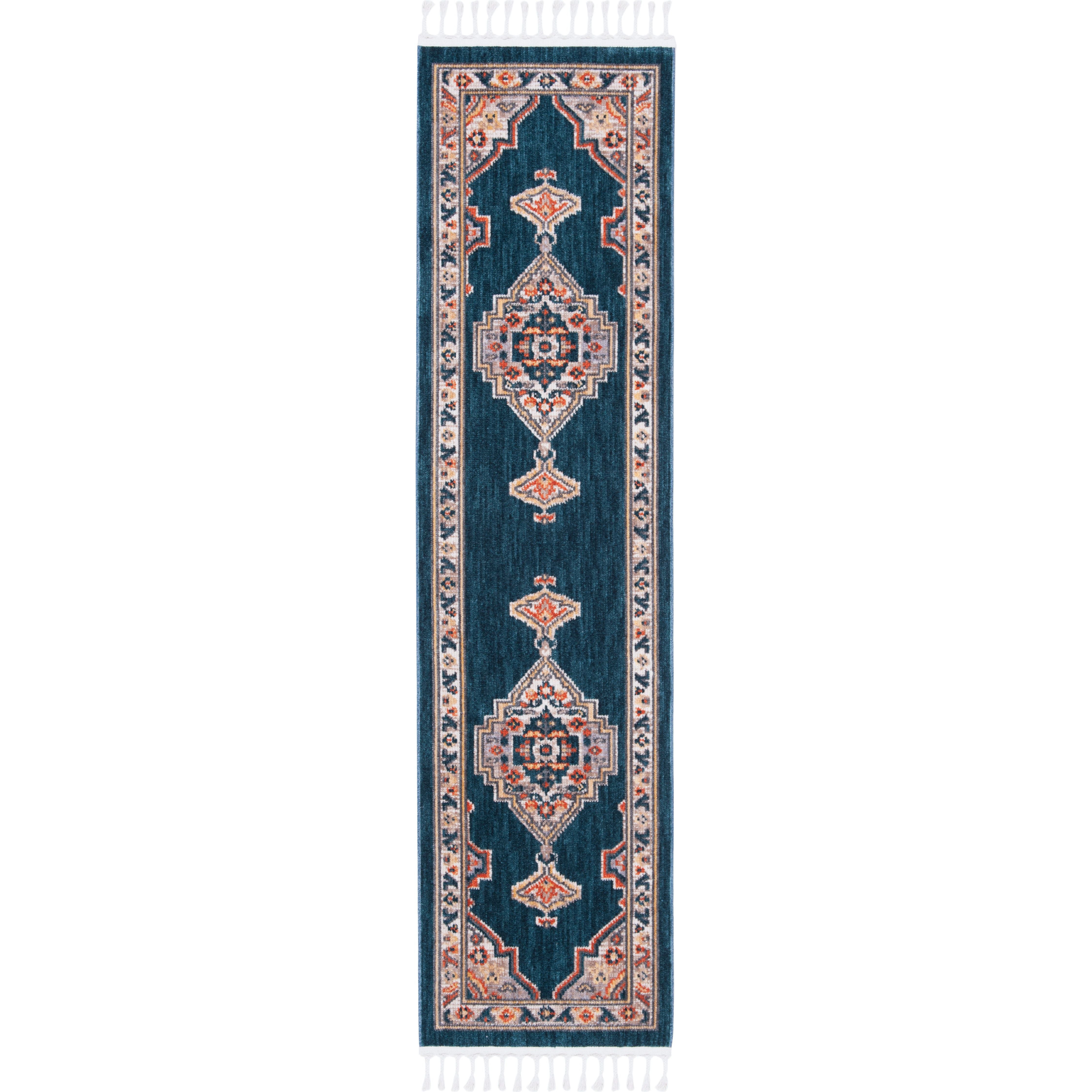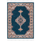 Introduce a touch of modern farmhouse charm to your space with the Farmhouse 800 FMH830N Cream Navy rug. This bohemian-inspired piece features braided tassels on each end, adding a stylish and effortless touch to your decor. The rug showcases a palette of blue, orange, yellow, and red hues reminiscent of traditional southwestern rugs.