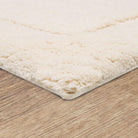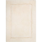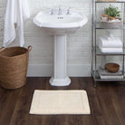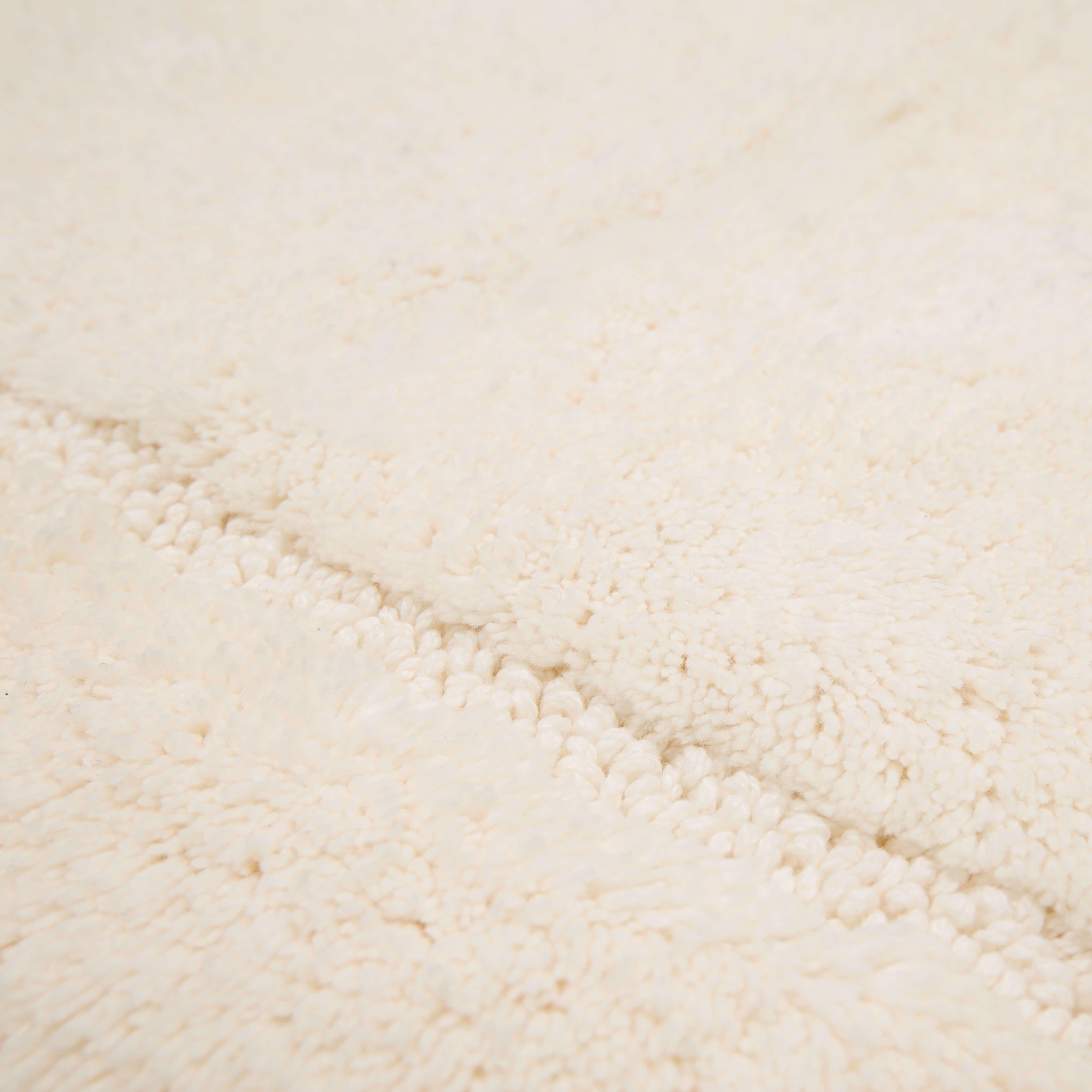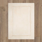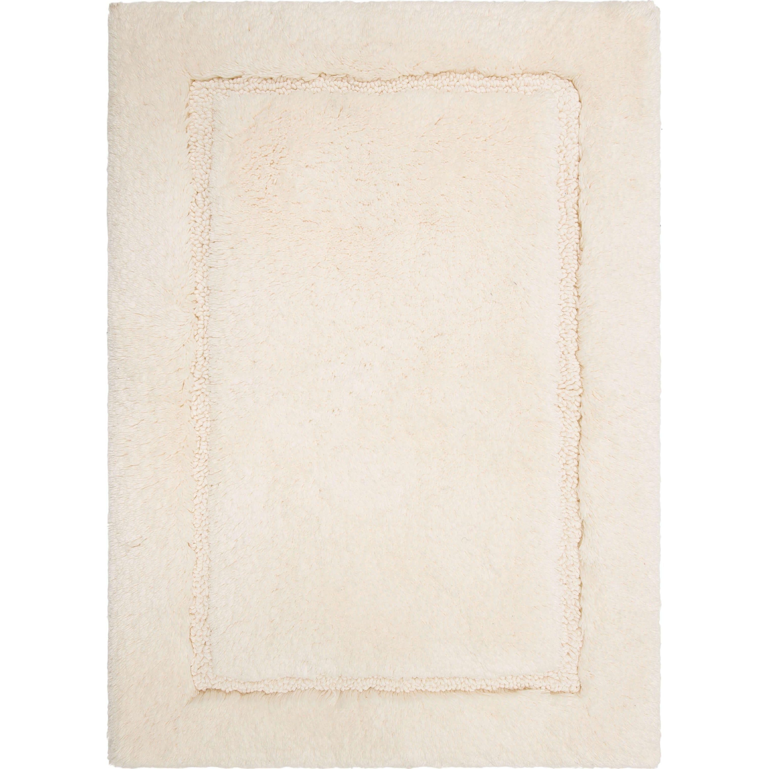 luxurious Regency Parchment bath rug, crafted with premium cotton yarns that undergo a double combing process to ensure a low-linting pile. The exquisite quality and subtle luster of this rug are achieved through a special spinning technique known as "ring" spinning. This unique design features a densely packed cut pile complemented by a delicate looped pile, enhancing its durability and timeless charm.