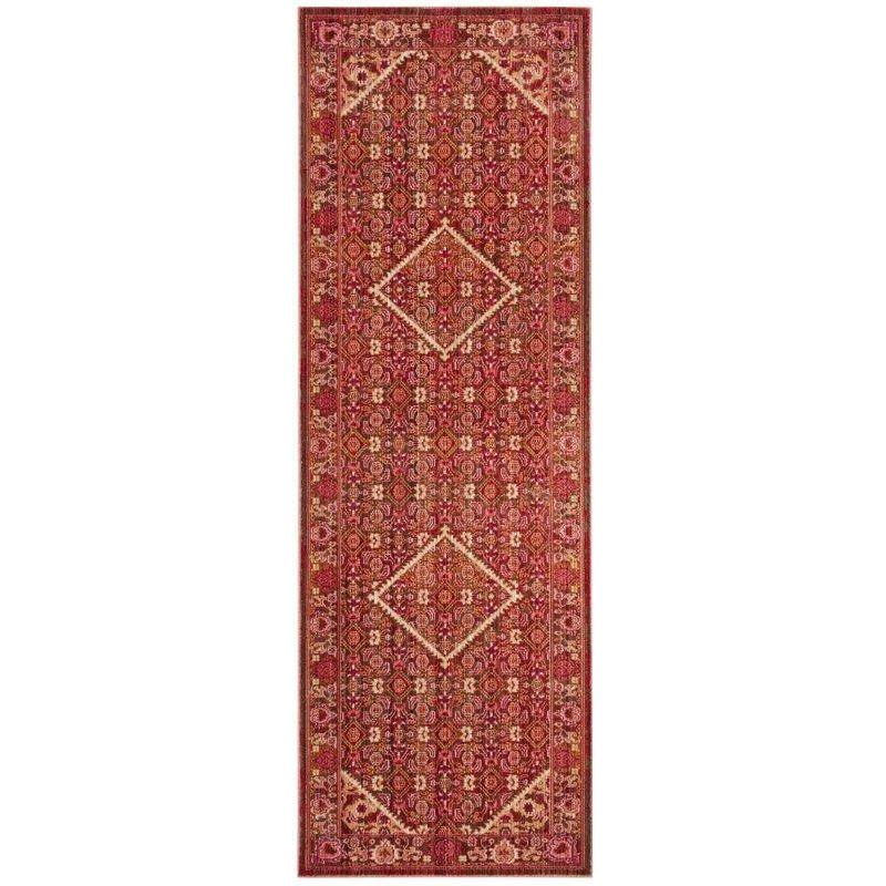 Sutton SUT407P Rust rug from the Safavieh Sutton collection. These stunning rugs effortlessly blend vintage charm with vibrant bohemian colors, making them the perfect addition to any transitional decor. Crafted with a blend of enhanced polyester and natural cotton, these rugs are not only durable but also have a luxurious silky sheen that exudes a designer aesthetic.