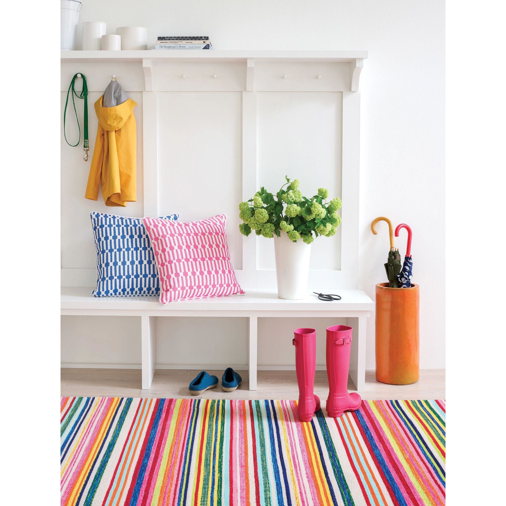 The Bright Stripe Handwoven Indoor/Outdoor Custom Rug is a fun, fresh, and colorful indoor/outdoor rug. This rug is lightweight, durable, and washable, making it the perfect solution for high-traffic areas such as kitchens, mudrooms, family rooms, playrooms, or patios.