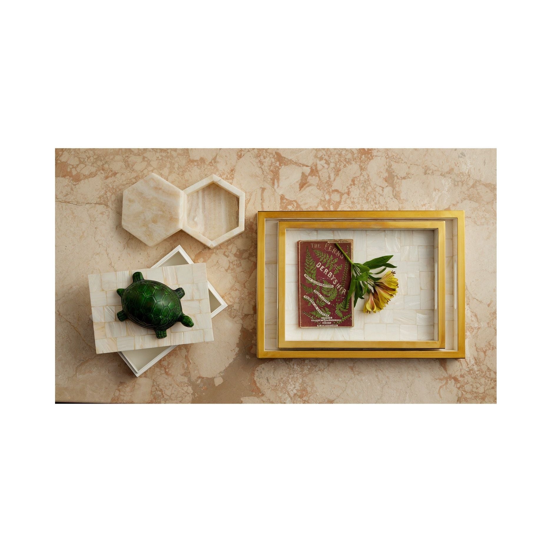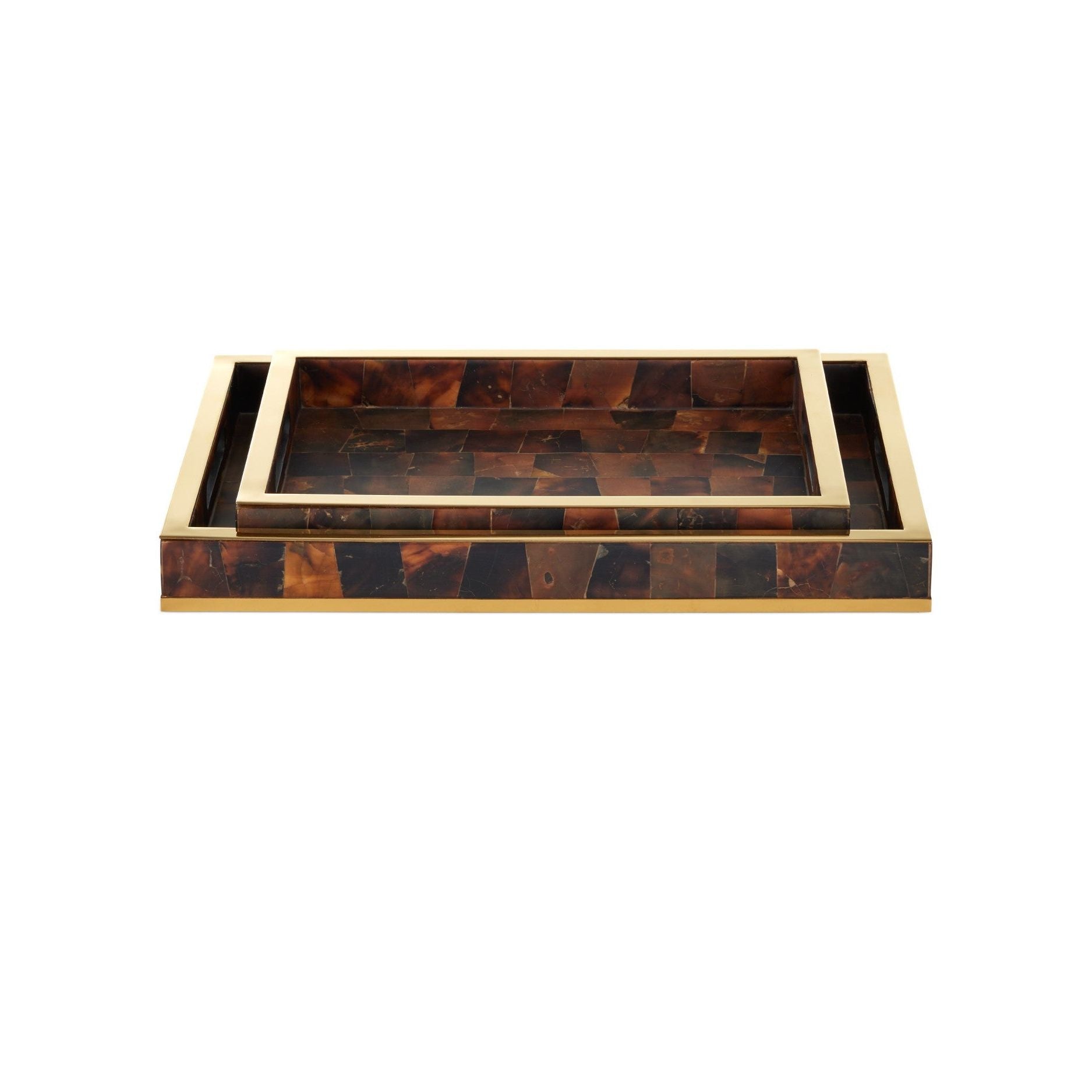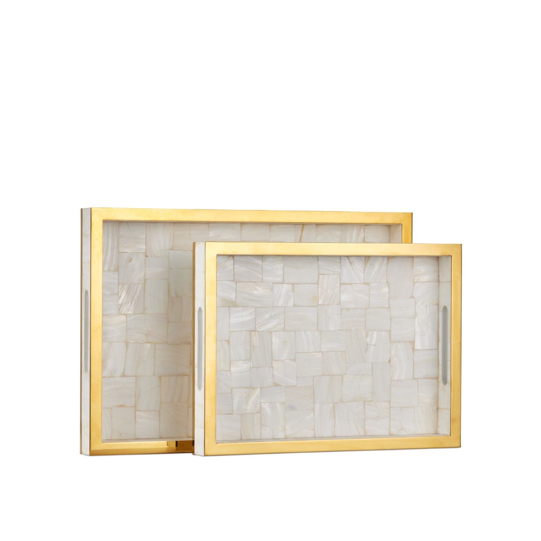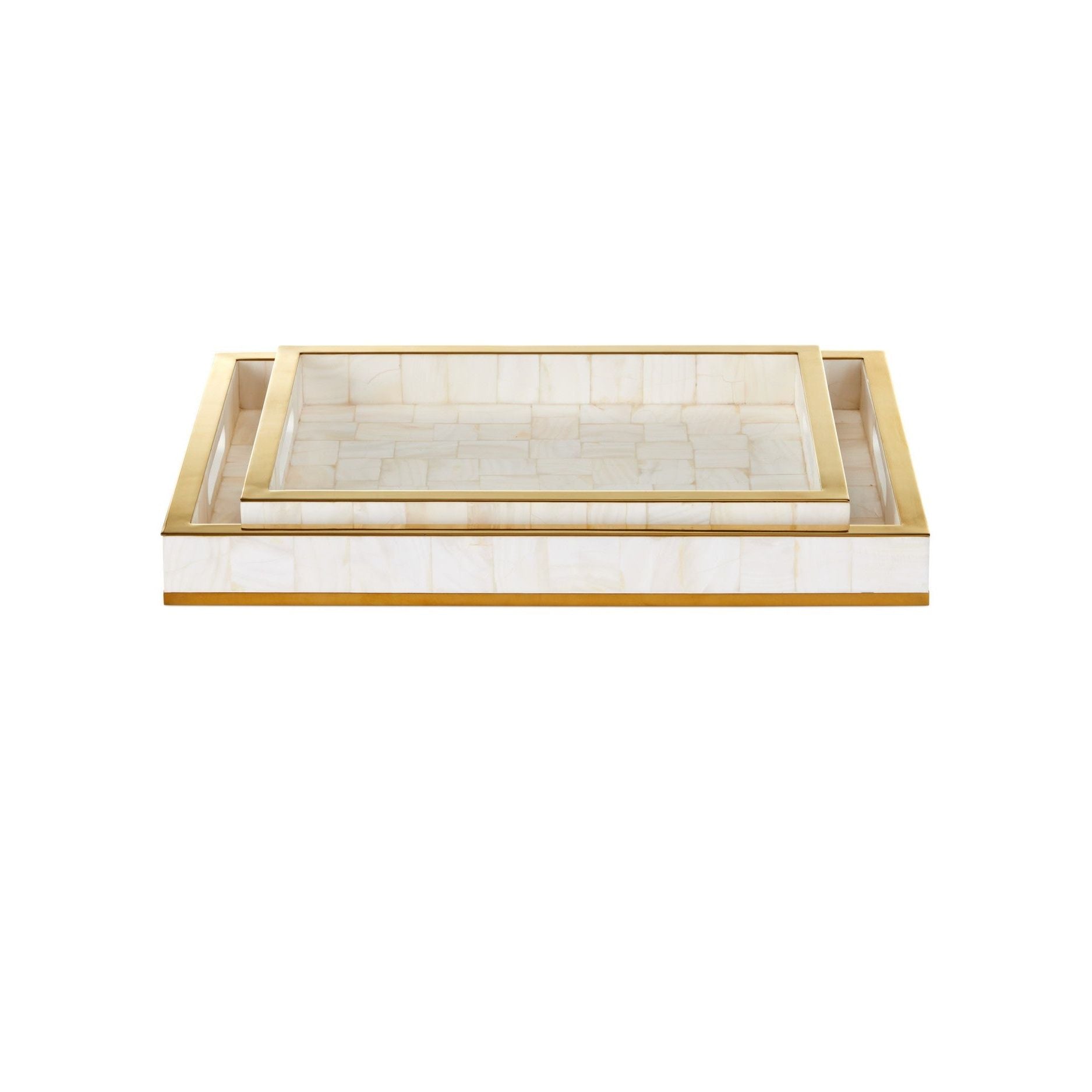 The luxe feel of a timeless material make the Casey Tray Set a striking display of fine artisanship. This elegant set includes a larger and smaller decorative tray, both crafted from shimmering mother-of-pearl and accented with rich gold details. Perfect for serving, organizing, or displaying treasured items, these trays exude timeless sophistication and will elevate any gathering with their radiant beauty.