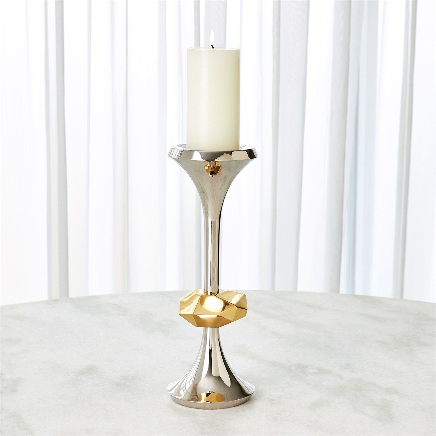 The Gabriel Nickel Candle Holder is made of nickel-plated brass and shiny brass. Holds 3 inch pillar candle.