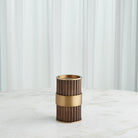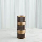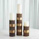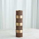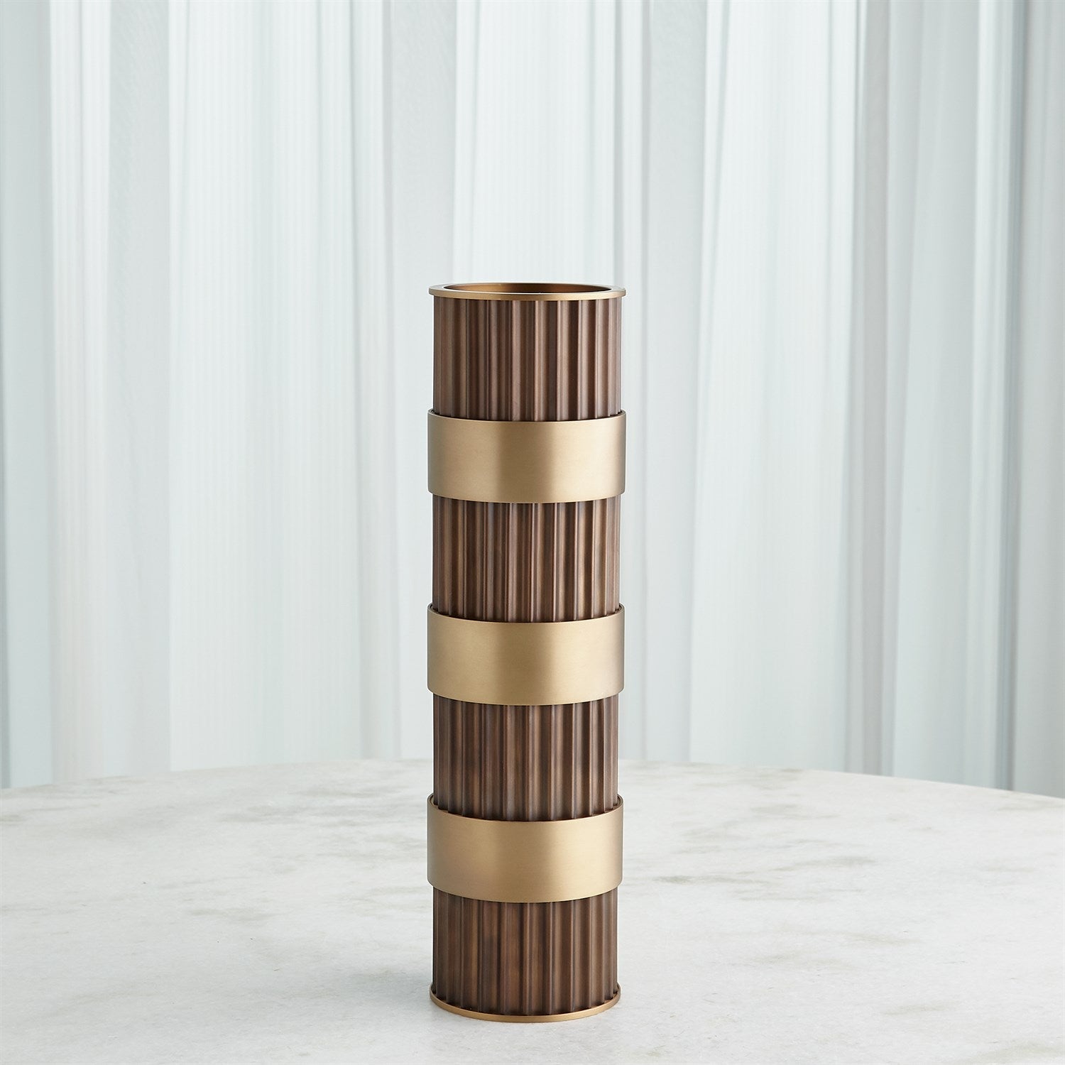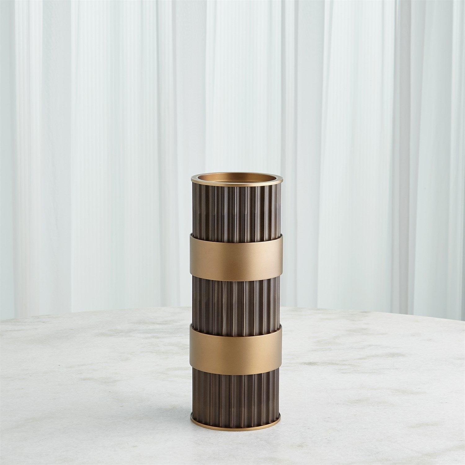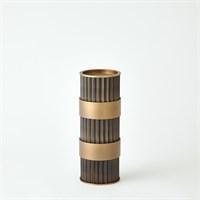 Representing Thomas’ enchantment with the simplest innovation for the cylindrical form, fluted column shafts referenced in the Magic Flute Collection are a hallmark of the apotheosis of Classic Greek architecture and then of the Neoclassical reinvention of Renaissance and late 18th-century French design. Made of brass and steel, each finished in bronze with brass detailing, this collection consists of two boxes, a cachepot, and candle holders.