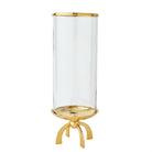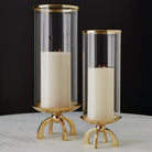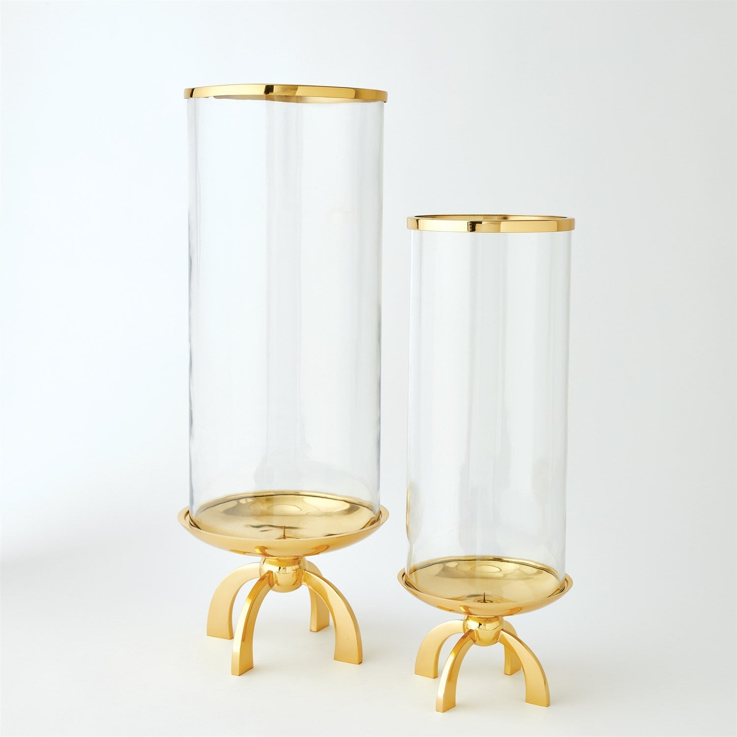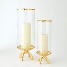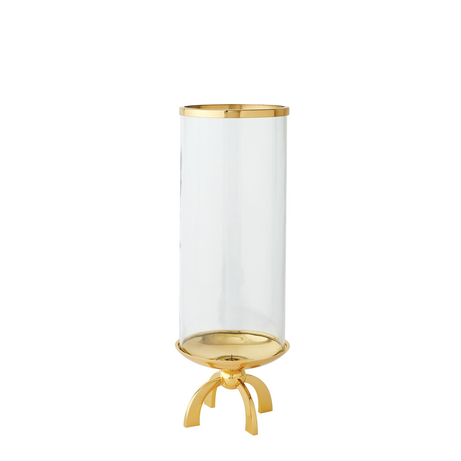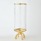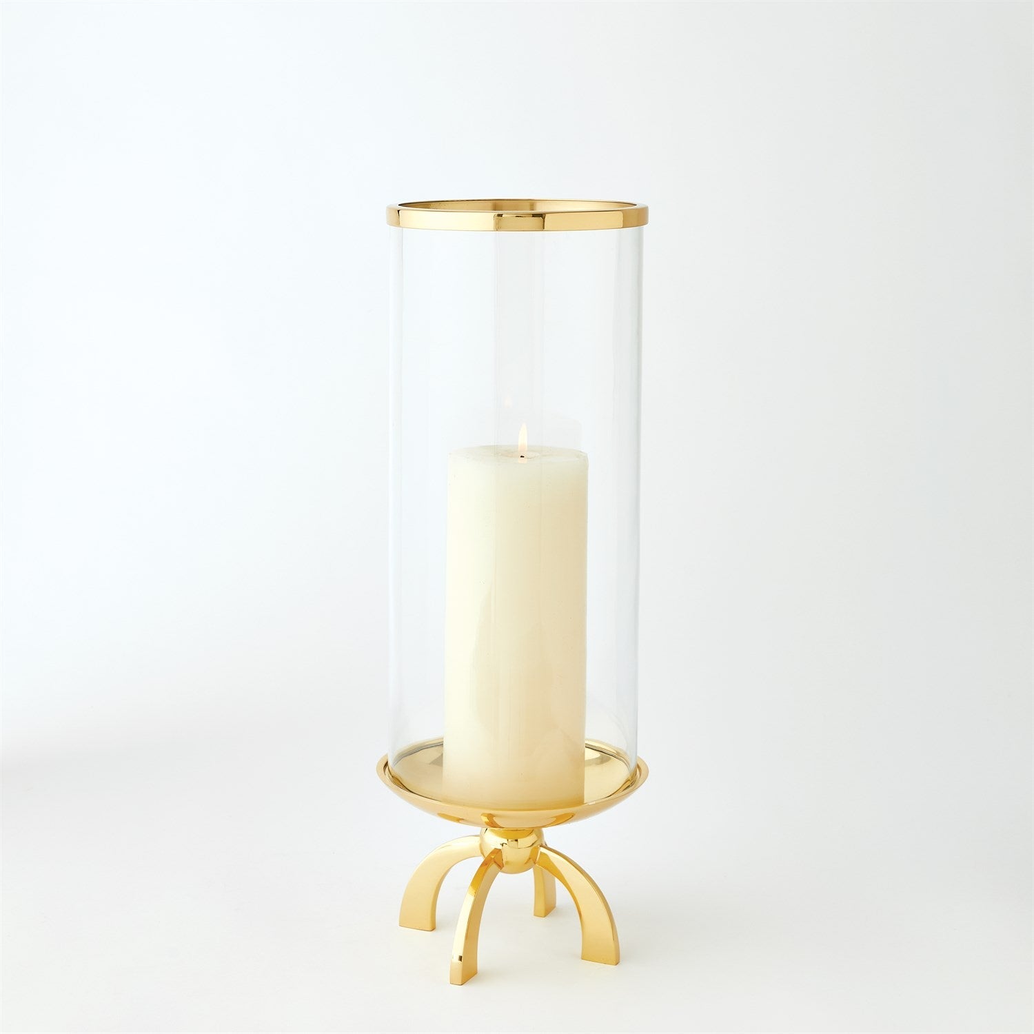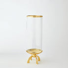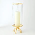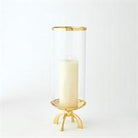 Quad Base hurricane made of cylindrical glass with a top band of shiny brass and a shallow brass finished dish.
