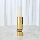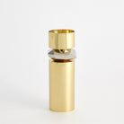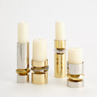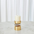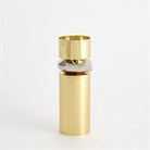 The Romano Brass Candle Holder is made of shiny brass and nickel-plated brass. Holds 3 inch pillar candle.