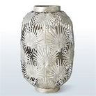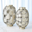 Candlelight filters through the pierced openings of our Palm Leaf Lantern Collection, creating beautiful light and shadows within your room. The Collection has an impressive scale and will take center stage in your setting. Available in 2 finishes, Bronze and Nickel, and 2 sizes, large and small. Use individually or as a set. Each sold separately.