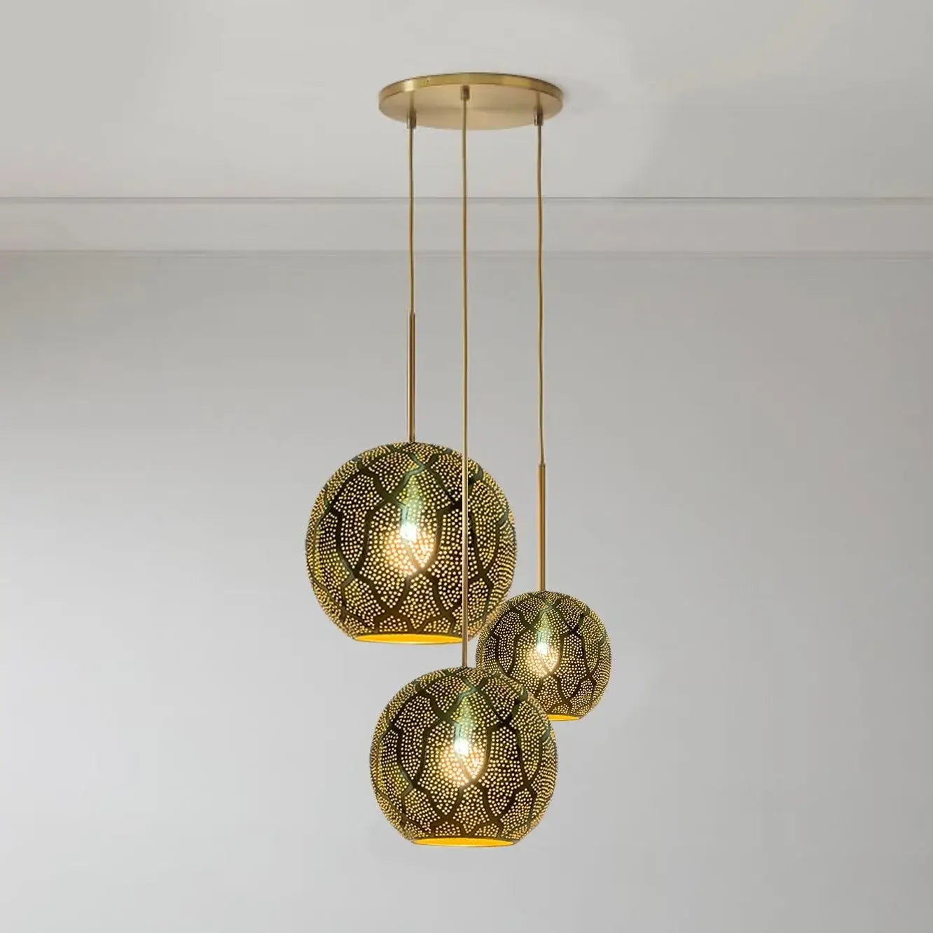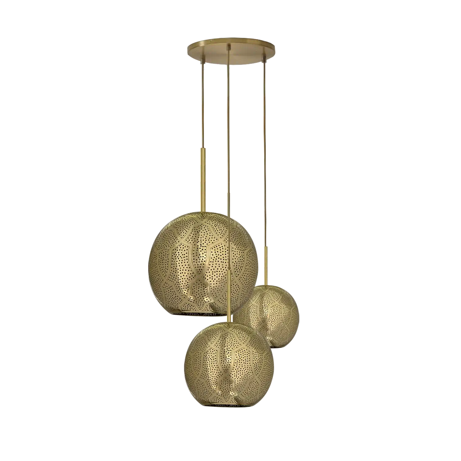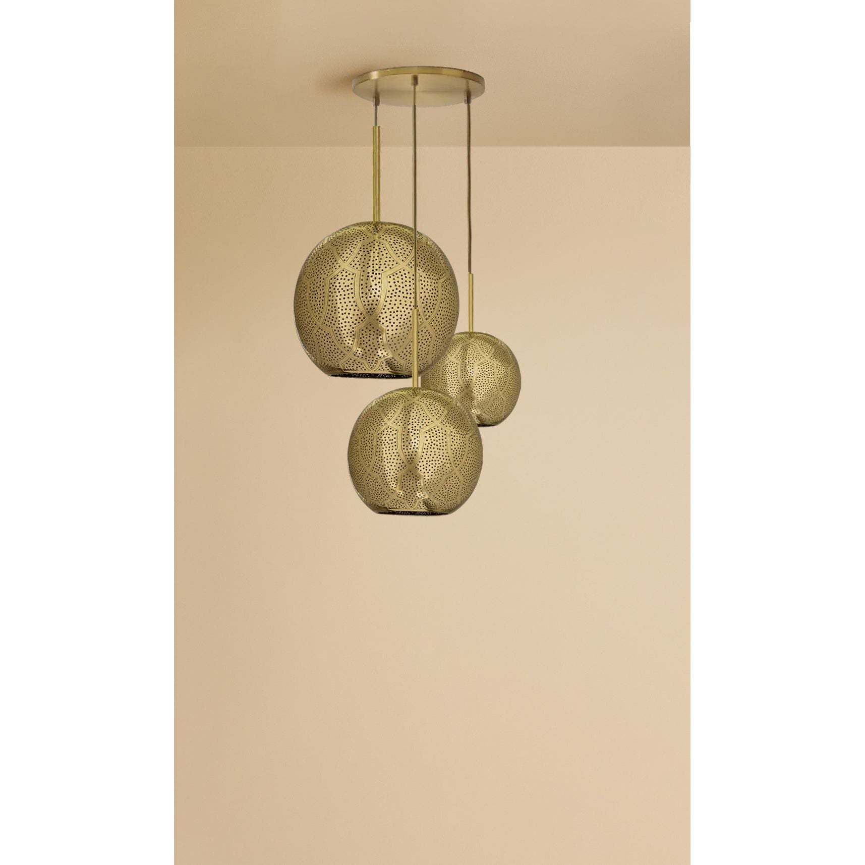 The Aria 3-Light Globe Chandelier is a stunning and unique lighting option. The combination of modern sphere shape with mid-century hints, along with the intricate punched metal and pierced designs made from semi-precious metals, create a luxurious and global feel. Handcrafted by master artisans in Marrakech, Morocco, is a true testament to its authenticity and artisanal quality. The intricate holes in the metal allow for beautiful shadow patterns to be cast on the walls while providing ambient lighting. Overall, the Aria 3-Light Globe Chandelier is an excellent choice for those looking to add a touch of Moroccan-inspired elegance and warmth to their homes.