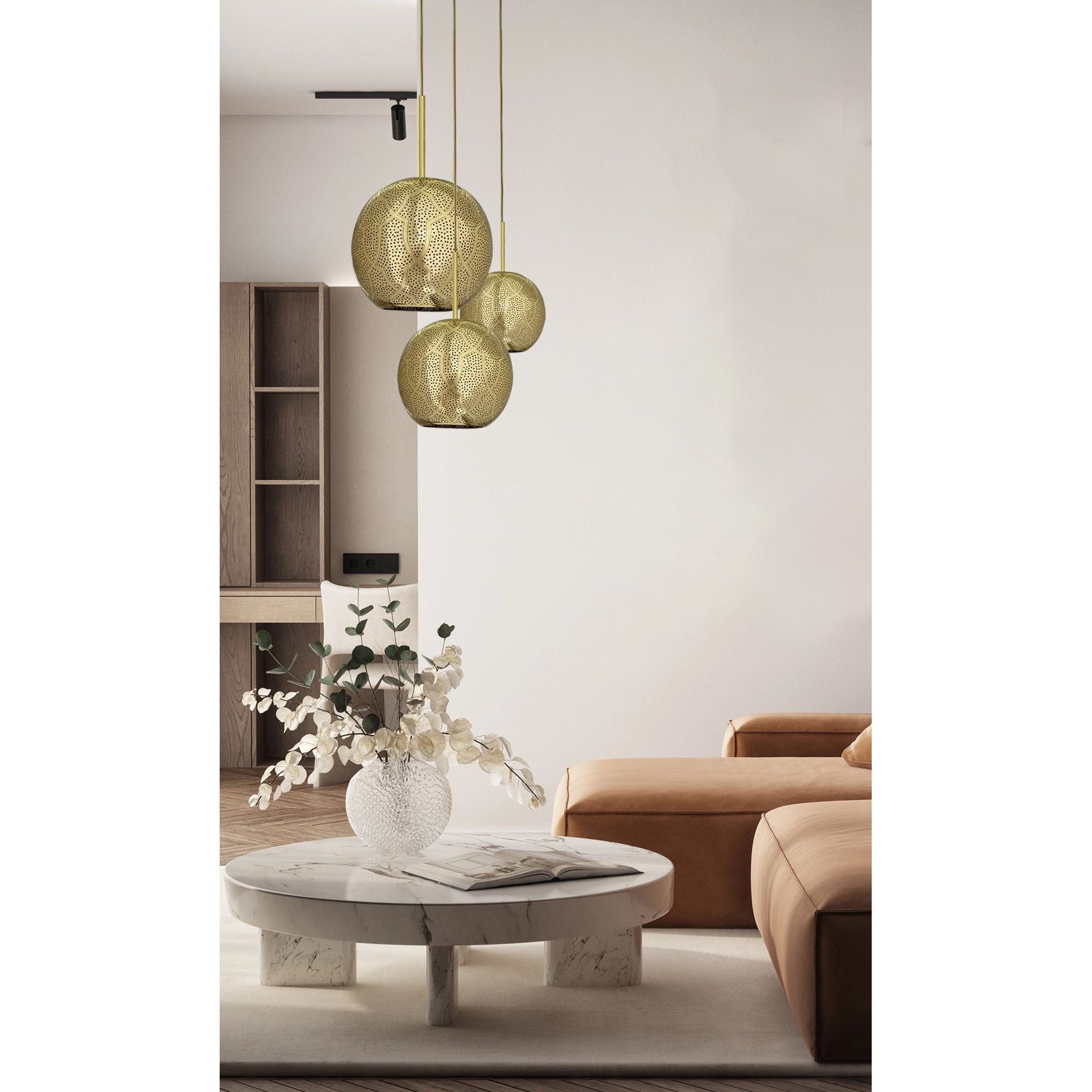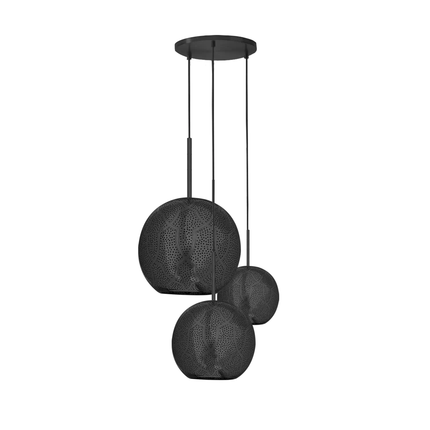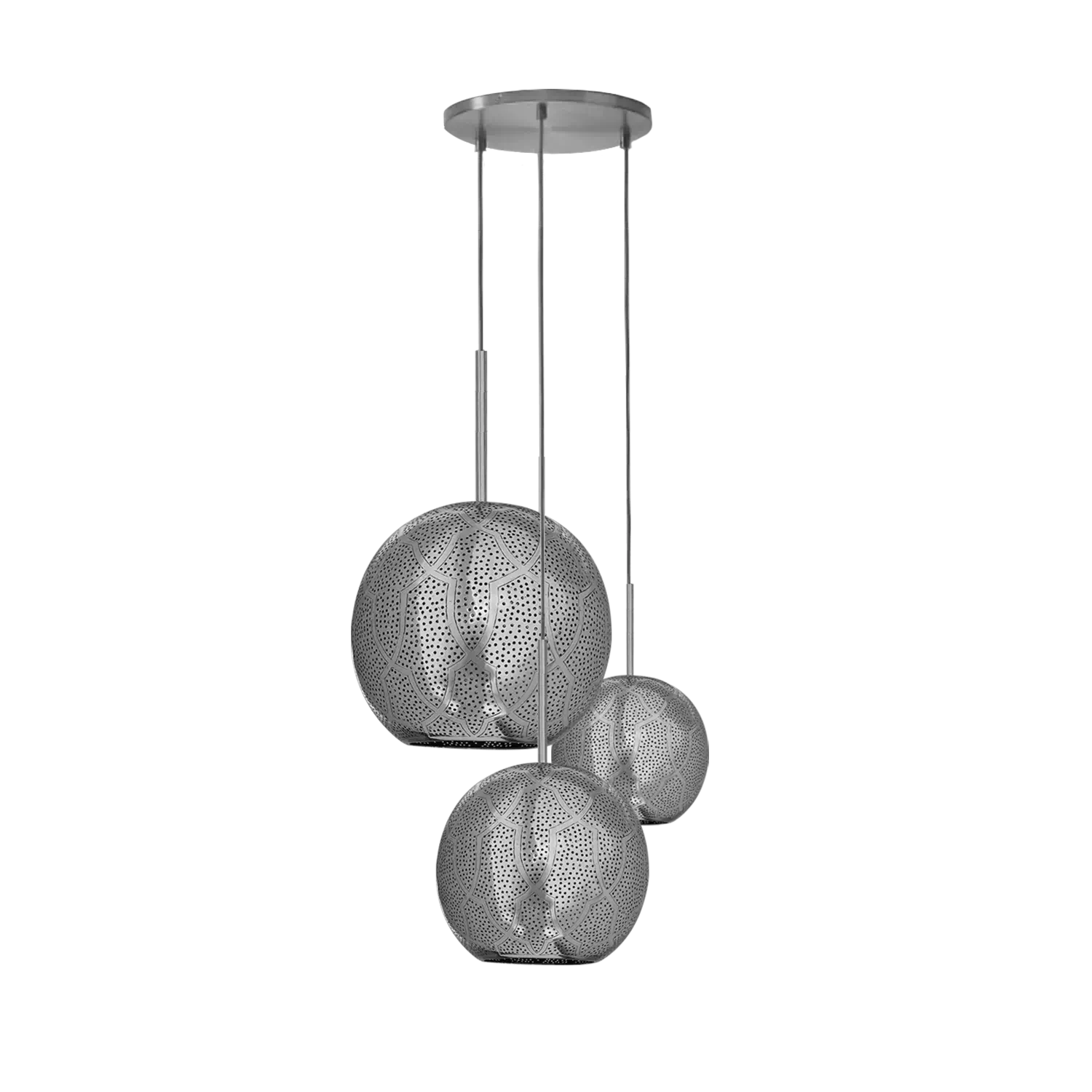 The Aria 3-Light Globe Chandelier is a stunning and unique lighting option. The combination of modern sphere shape with mid-century hints, along with the intricate punched metal and pierced designs made from semi-precious metals, create a luxurious and global feel. Handcrafted by master artisans in Marrakech, Morocco, is a true testament to its authenticity and artisanal quality. The intricate holes in the metal allow for beautiful shadow patterns to be cast on the walls while providing ambient lighting. Overall, the Aria 3-Light Globe Chandelier is an excellent choice for those looking to add a touch of Moroccan-inspired elegance and warmth to their homes.