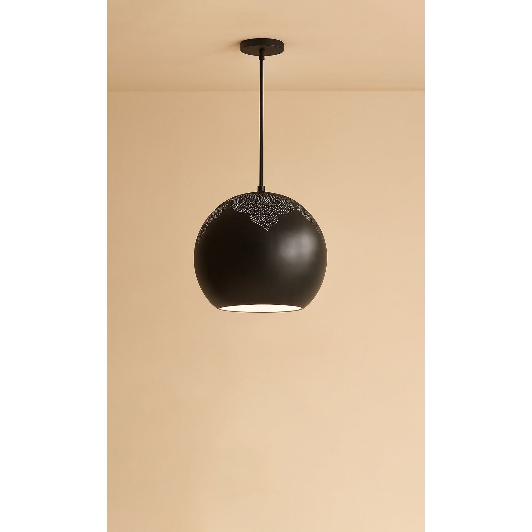 Gorgeous rich metals. Century-old design. This modern Moroccan pendant light is a stunner. With its hand-shaped, hand-etched, and hand-pierced shade this unique piece is an instant show-stopper. The intricate hand-pierced trellis pattern casts exquisite shadows onto the space around it while providing a focused light at its base. FEATURED IN THE PRESSOttawa Magazine , LOA