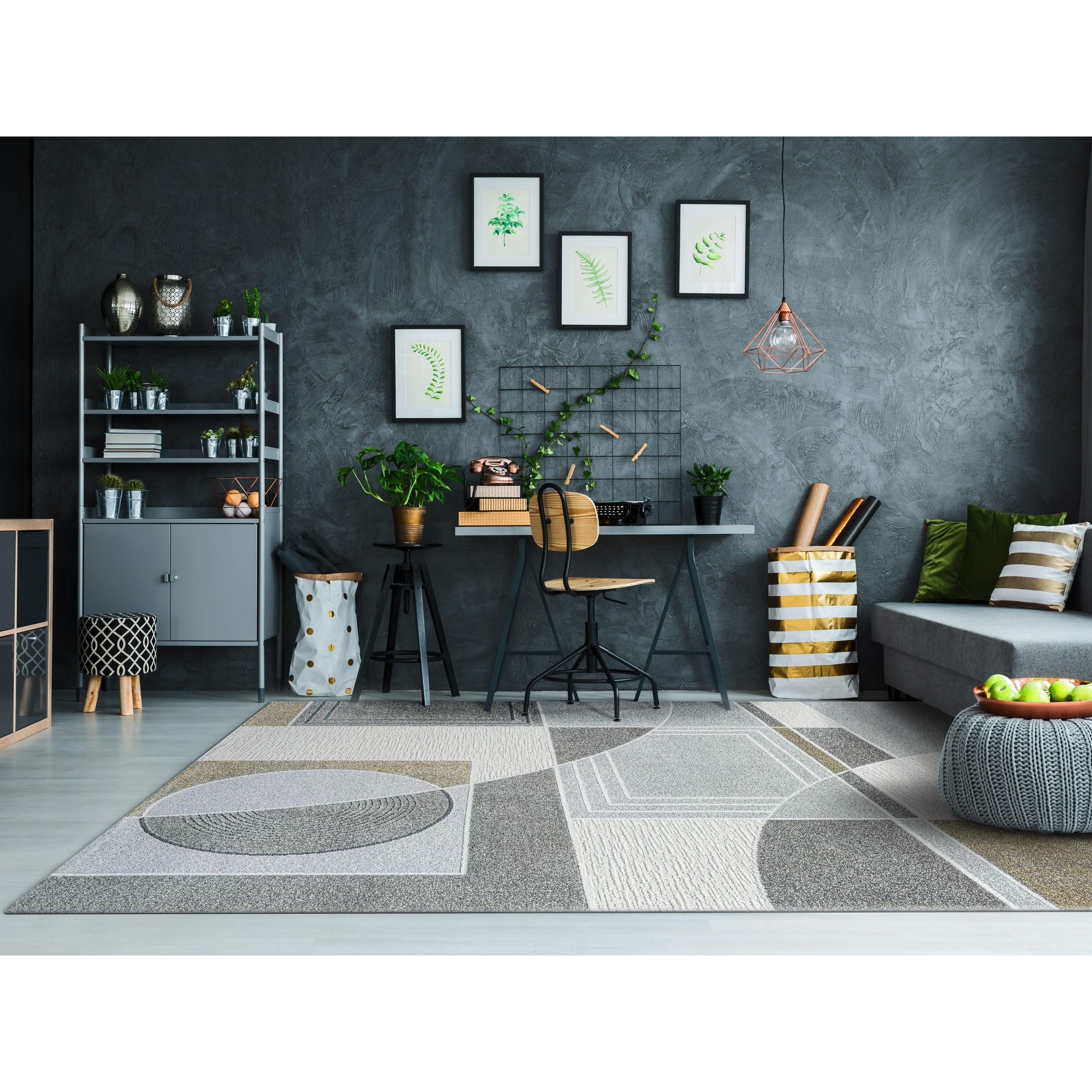Polaris 46012 Ivory Grey Gold rug, a stylish fusion of geometric shapes in an asymmetrical pattern that reimagines a 70s aesthetic with a modern twist. Crafted from a durable blend of polyester and polypropylene, this rug offers a balance of smoothness and resilience for long-lasting use. The elegant shades of teal, gold, and burgundy beautifully complement the intricate design, while neutral tones of ivory and grey provide a versatile backdrop for any decor.