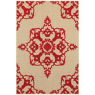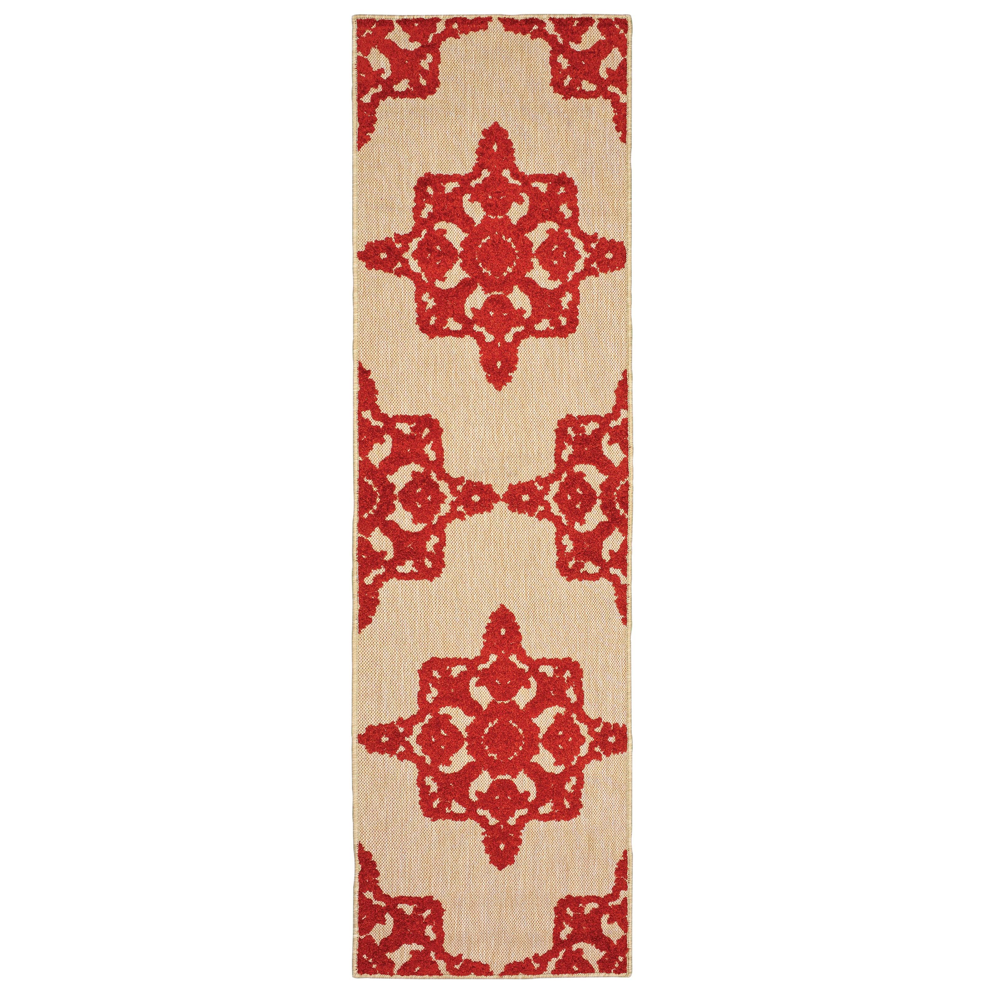 Cayman 097R9, a versatile addition to your indoor or outdoor space. Crafted with 100% polypropylene and a unique high/low effect, this machine-woven rug offers a blend of textured, tri-colored yarns in a mix of cut pile and flat weave construction. The vibrant color palette includes tangerine, lime, Mediterranean blue, cherry red, charcoal, and bright strawberry pink against a natural sand background. Geometric and global-inspired patterns add a modern flair to any room.