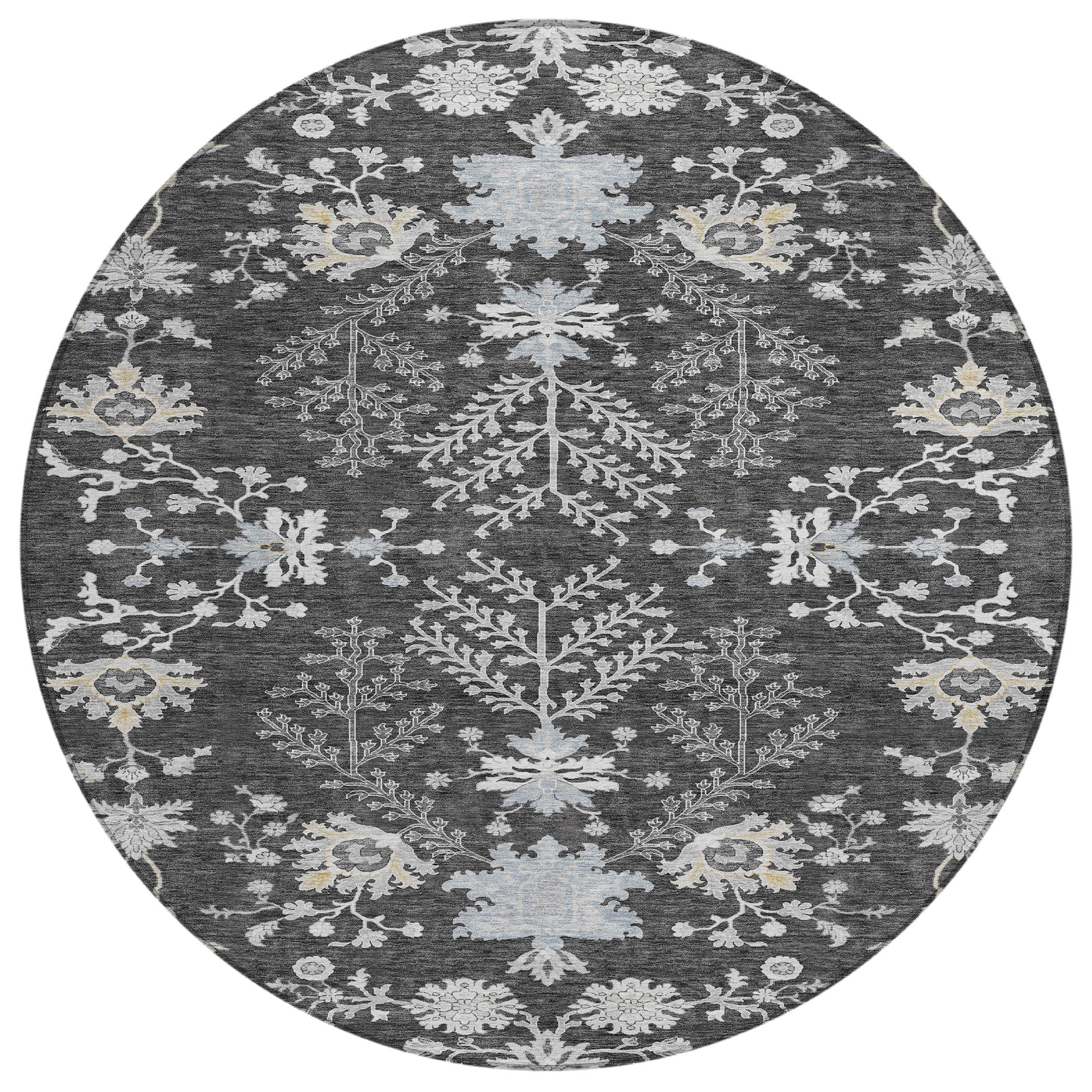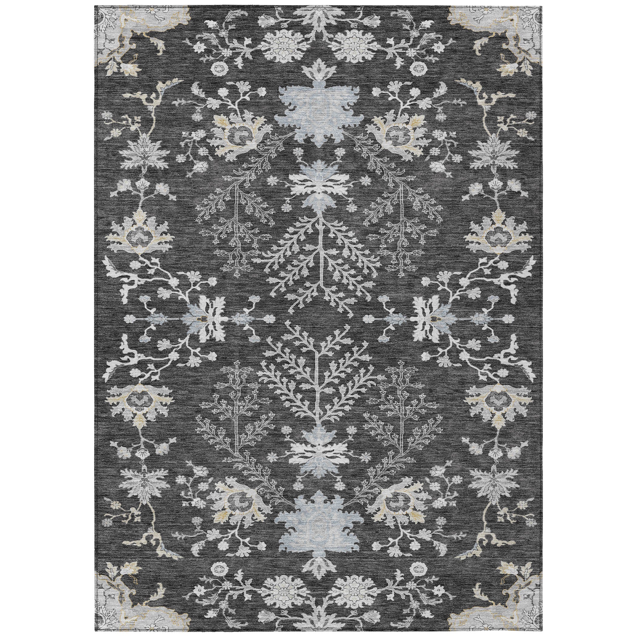 Elevate your home decor with our area rug, featuring an open space design adorned with small intricate motifs that seamlessly blend transitional and floral styles. This rug adds a touch of elegance and sophistication to any room. UV stabilized for both indoor and outdoor use, it ensures lasting vibrancy and durability. Its ultra-thin construction makes it easy to handle and position, while the machine-washable fabric ensures it stays fresh and clean, perfect for families and pet owners.