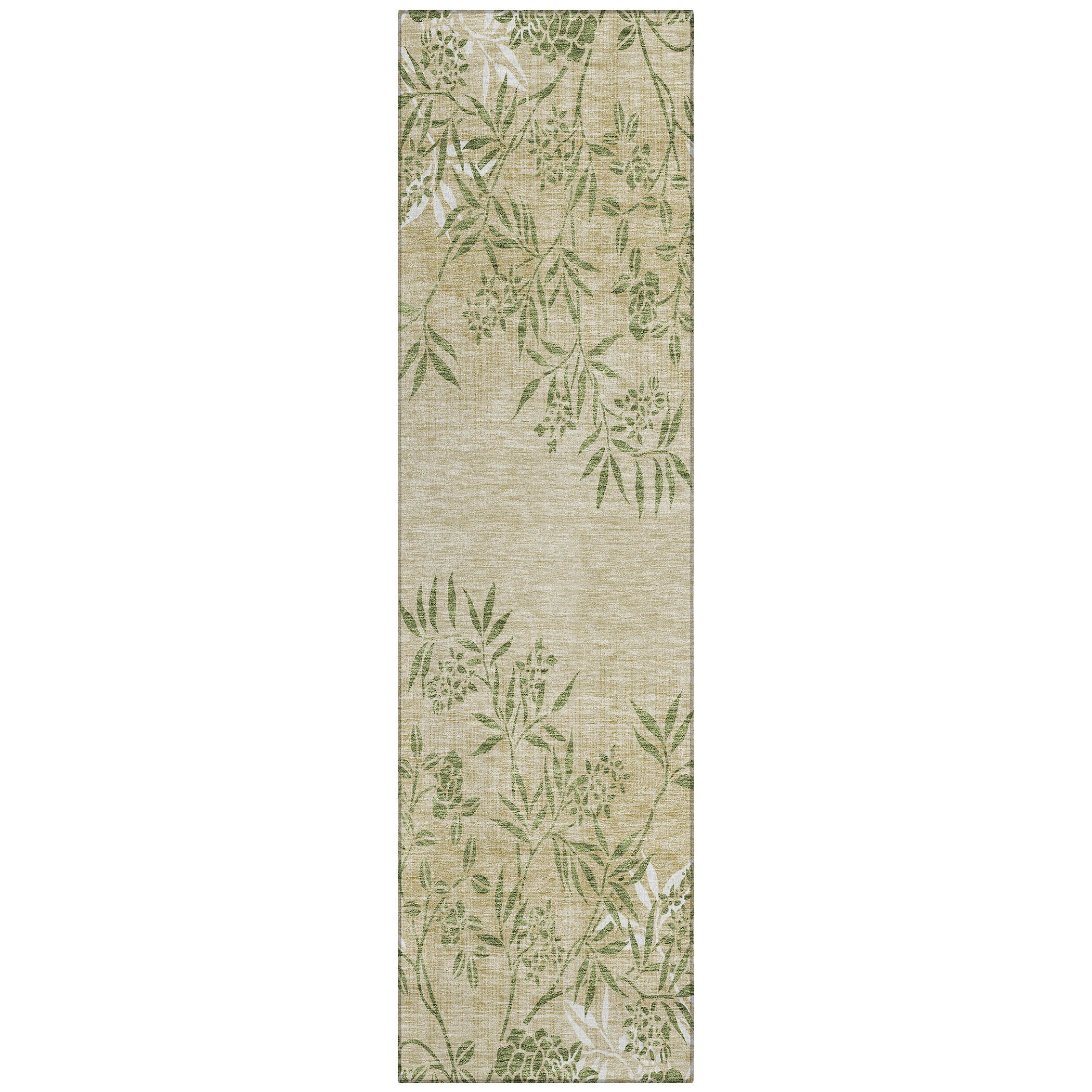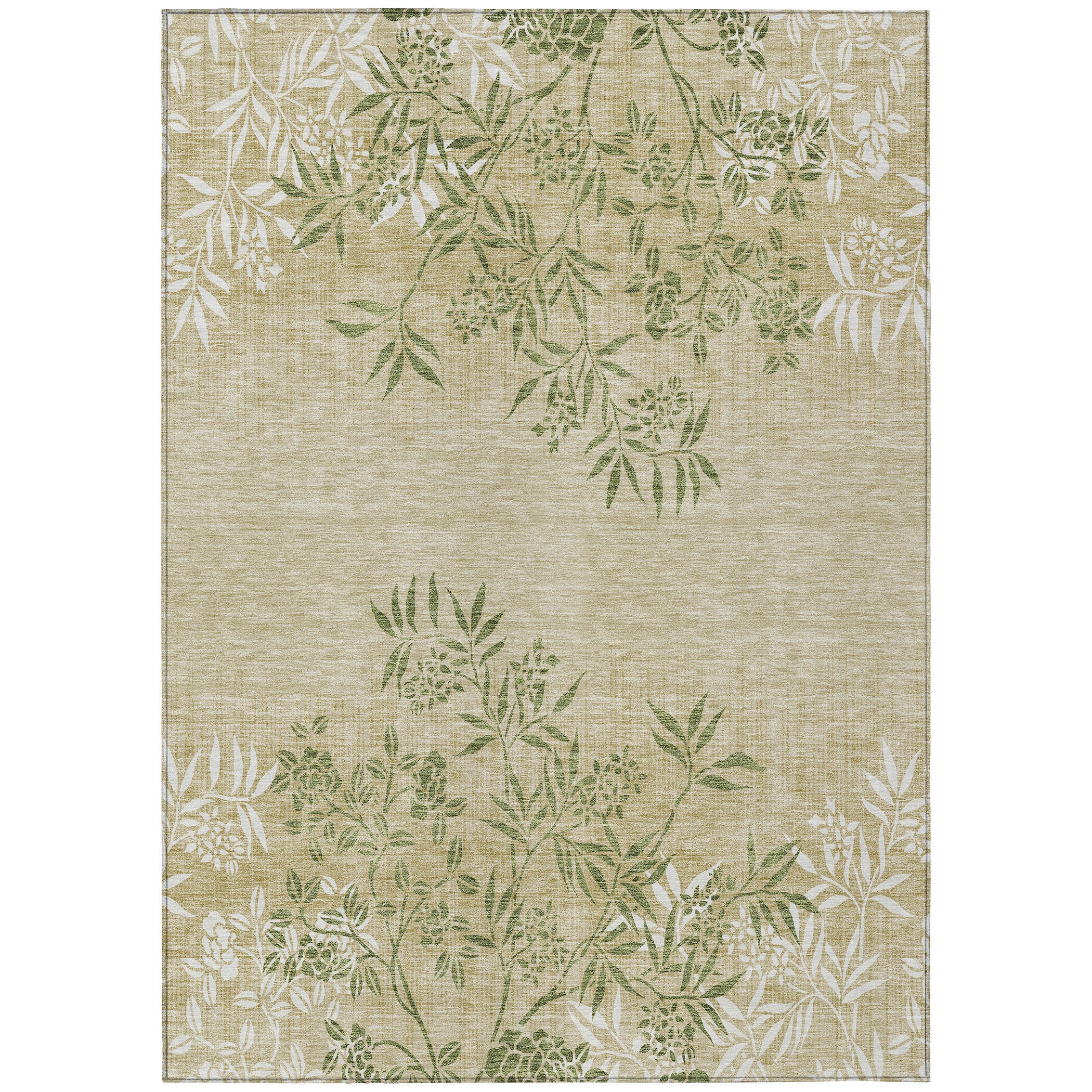 Chantille ACN673 Khaki area rug, a stunning piece that effortlessly blends nature-inspired elements with modern design. The intricate leaf stems gracefully cascade from the top and bottom, creating a harmonious and transitional floral composition that adds a touch of organic allure to any space.